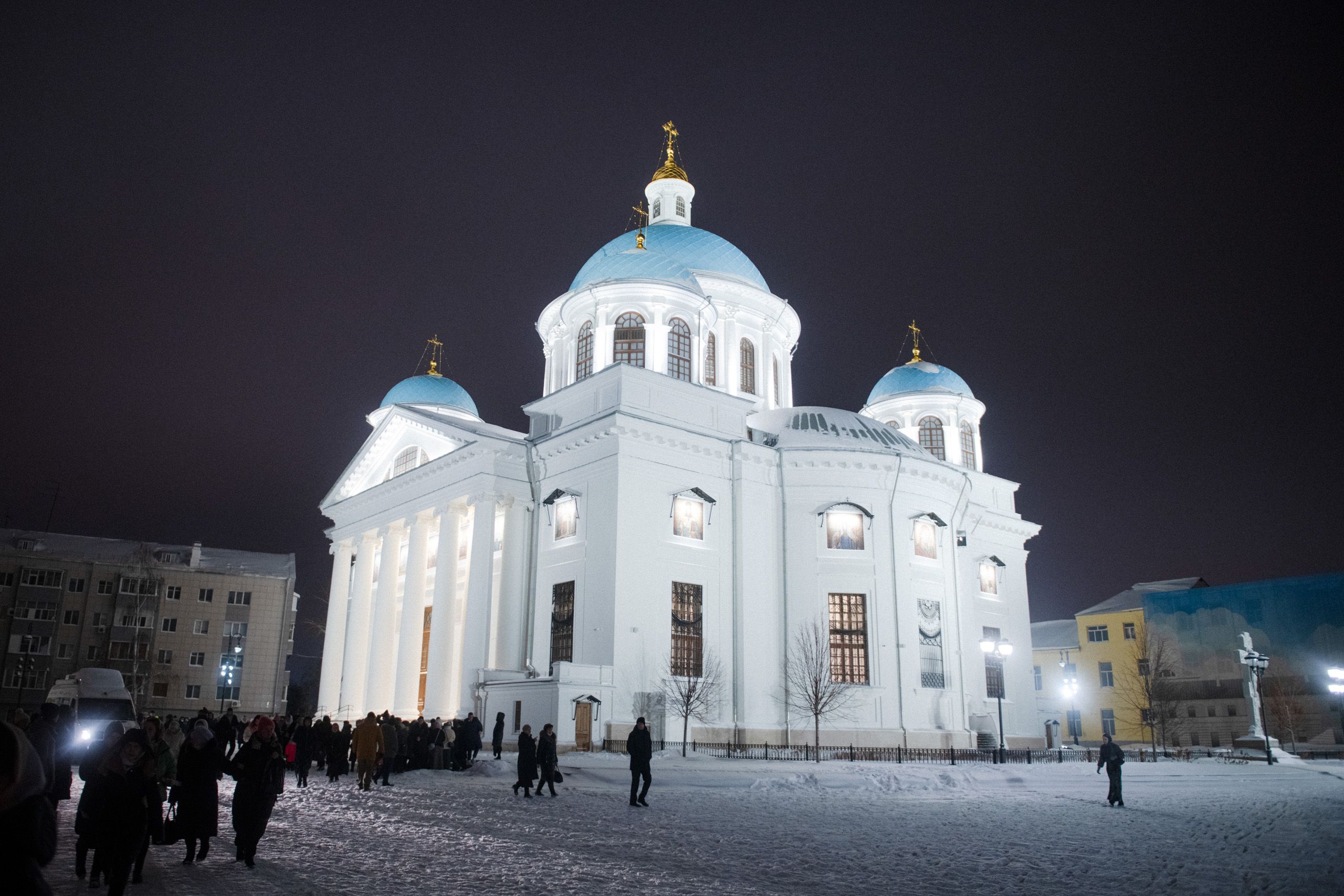 В завершение Литургии духовенство пропело тропарь, кондак и величание праздника. Архиерейские хоры исполнили рождественские колядки, а в небе над Казанским собором прогремел праздничный салют.