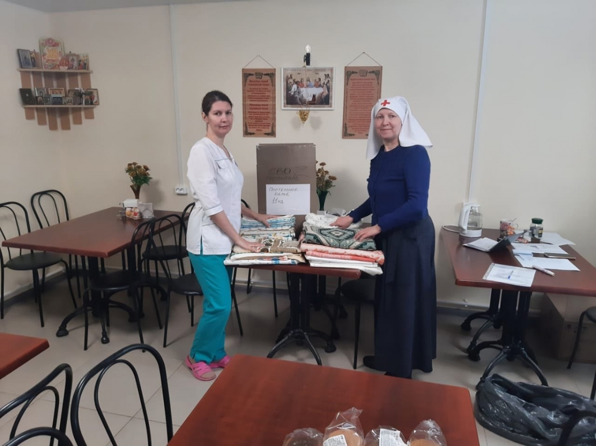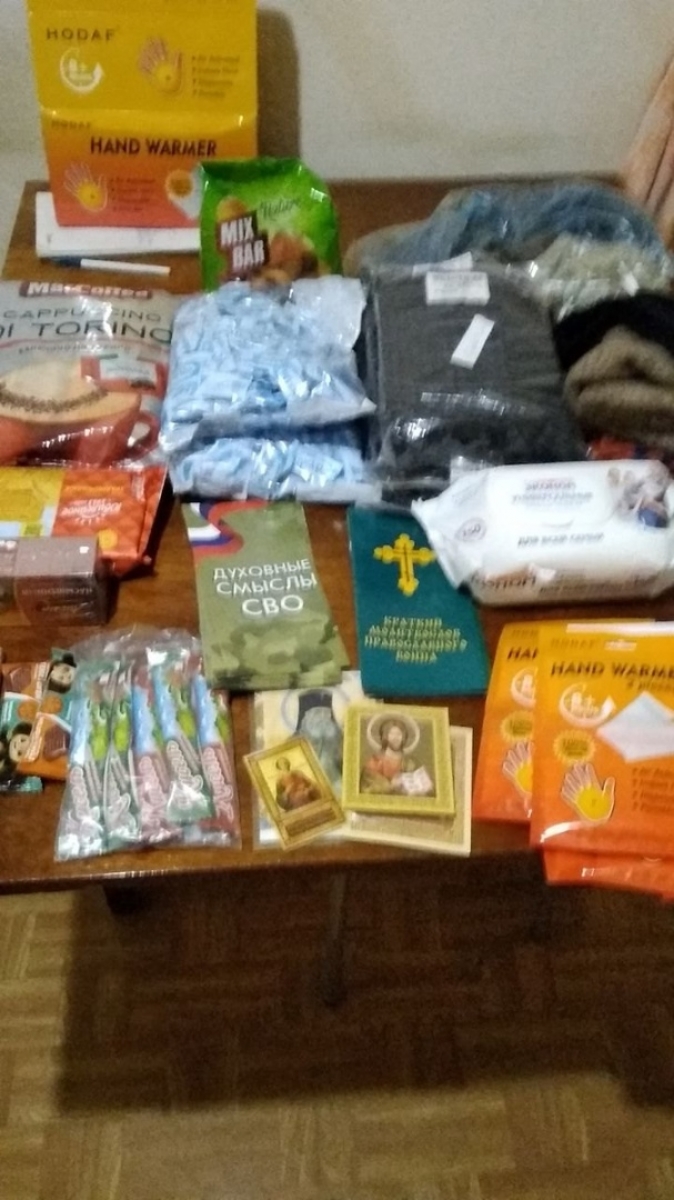 Коробки с гуманитарной помощью, в состав которых вошли иконки карманные, просфоры, крестики с гайтанчиком, буклеты (о духовных смыслах СВО и краткий молитвослов православного воина), постельное бельё, полотенца, пеленки непромокаемые, памперсы, подгузники (трусы), трико, носки шерстяные, химические грелки для рук и ног, лекарственные препараты для проведения искусственной вентиляции лёгких, браслеты тактические, чай, кофе, конфеты, шоколад, кисель, сухари, сухофрукты, печенье и другие необходимые для бойцов предметы были собраны и переданы для дальнейшей отправки в пункт назначения.