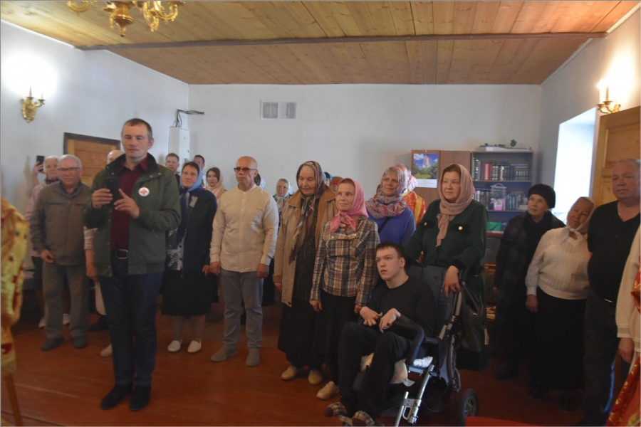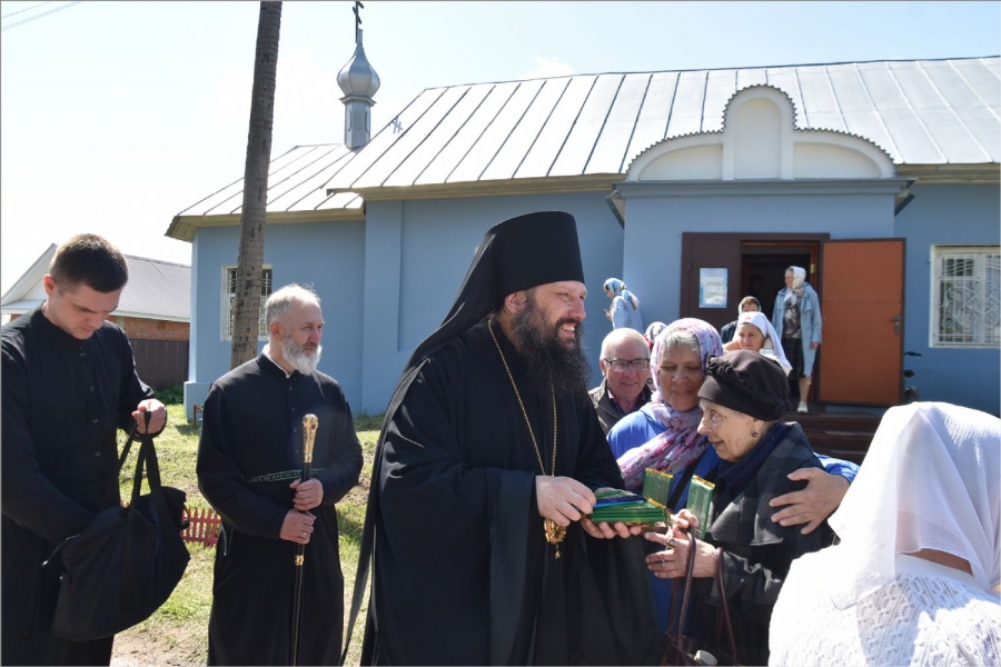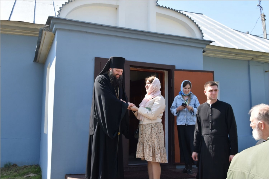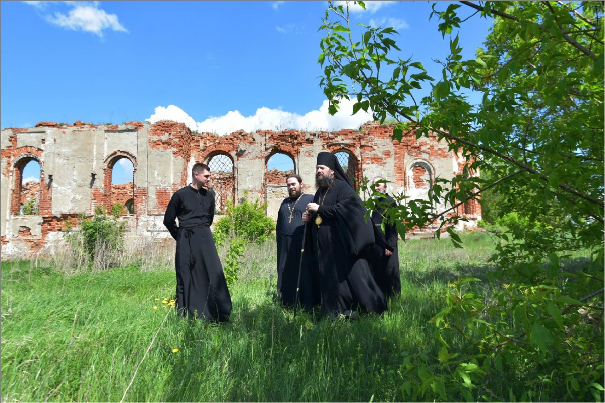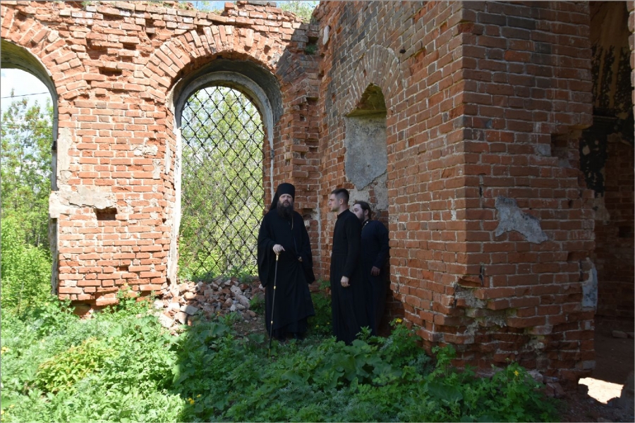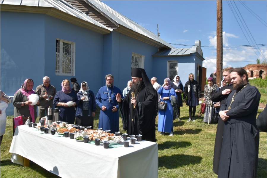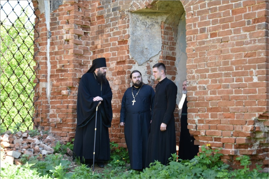 После богослужения архипастырь посетил общую трапезу на улице, пообедал и пообщался с прихожанами, а затем посетил руинированный храм Архангела Михаила, где осмотрел здание и его территорию. Настоятель прихода иерей Илья Кривов рассказал об истории церкви.