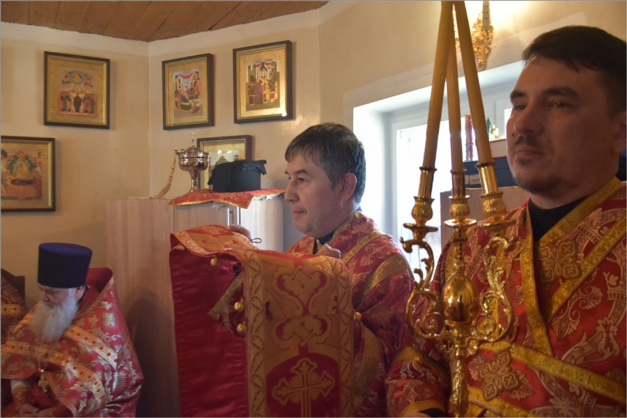 Архипастырю сослужили секретарь Набережночелнинской епархии протоиерей Андрей Лосык, благочинный Елабужского округа иеромонах Кирилл (Забавнов), благочинный Набережночелнинского округа протоиерей Андрей Дубровин, настоятель молельного дома Архангела Михаила села Танайка Елабужского округа иерей Илья Кривов, протодиакон Дмитрий Половников.