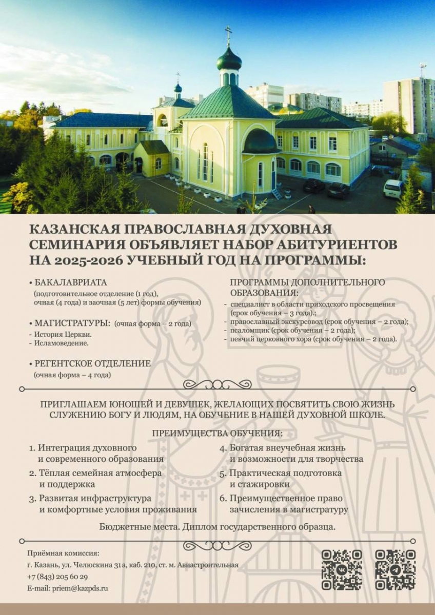 20 июня началась приёмная кампания в Казанской духовной семинарии. Казанская духовная школа приглашает абитуриентов на следующие направления: