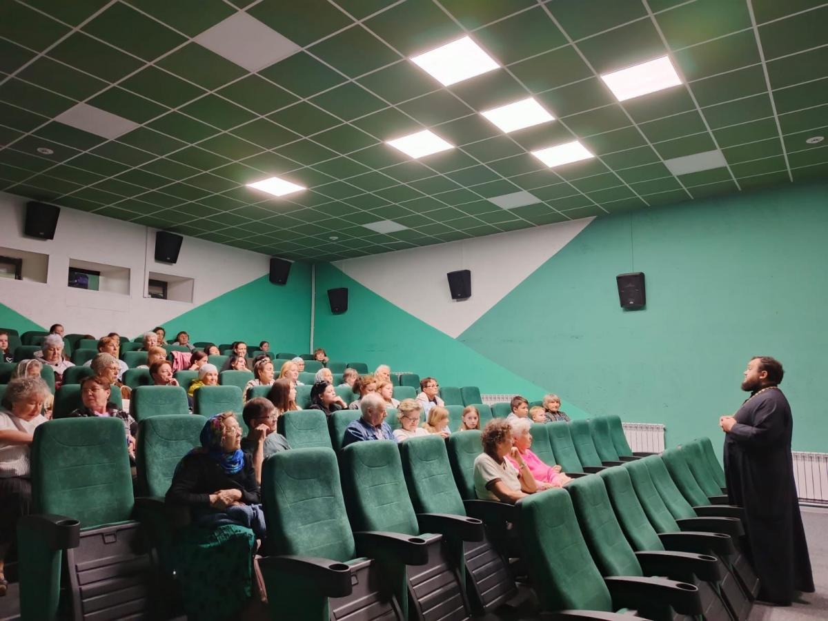 С вступительным словом к зрителям обратился настоятель Спасского собора иеромонах Кирилл (Забавнов).