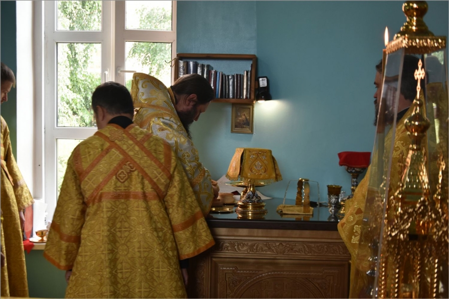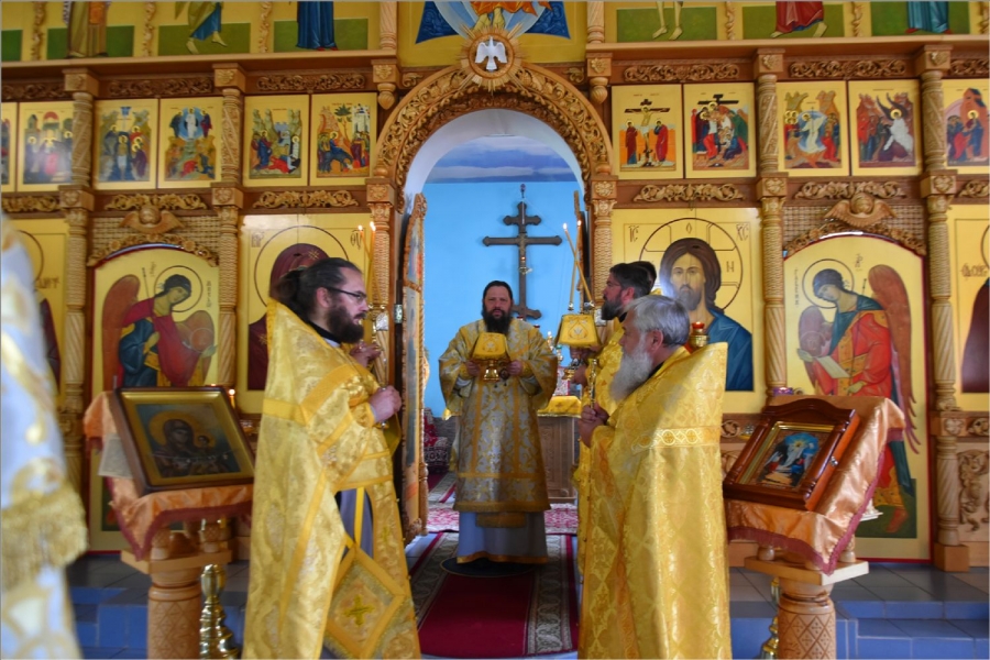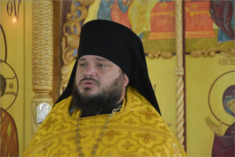 На сугубой и мирной ектениях были вознесены молитвы о Российском воинстве и о мире. С проповедью по запричастном стихе к верующим обратился иеромонах Кирилл (Забавнов).