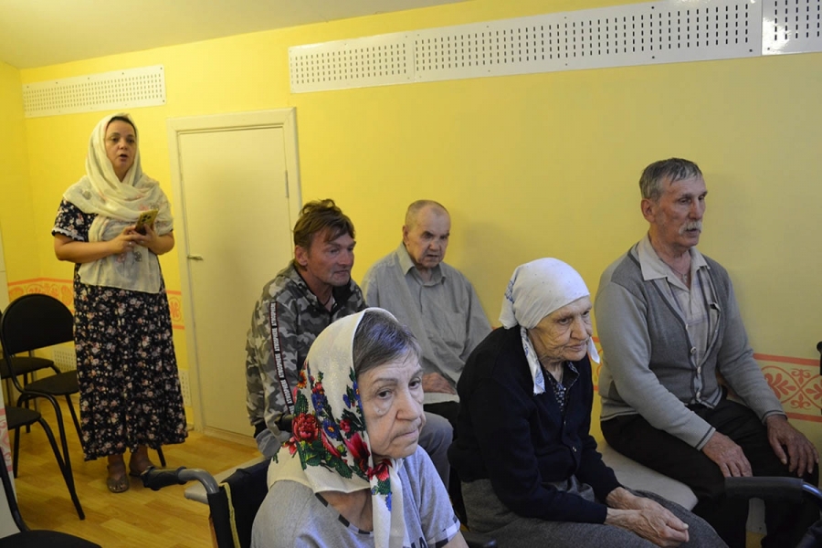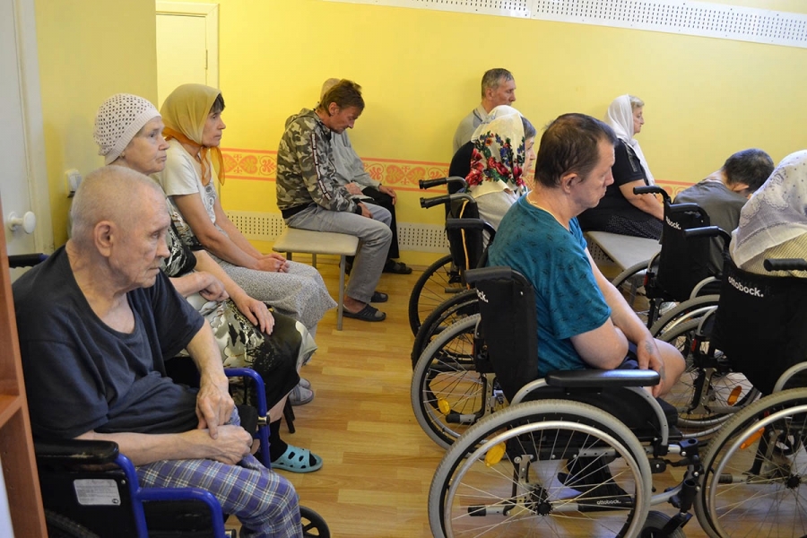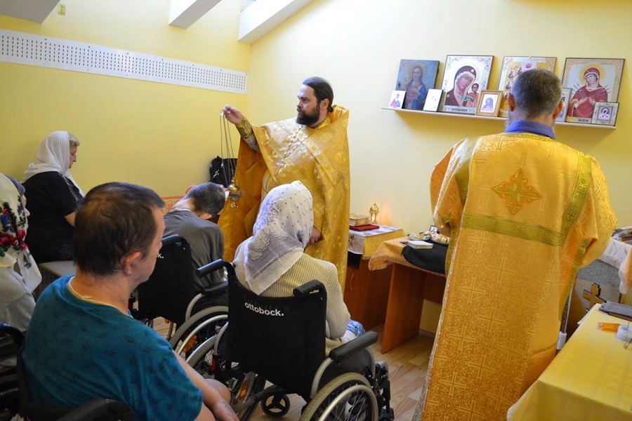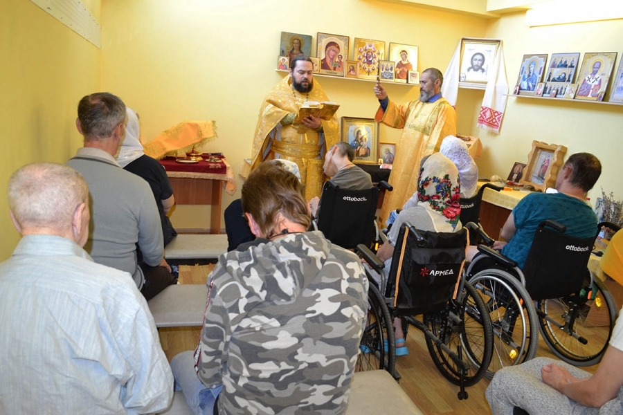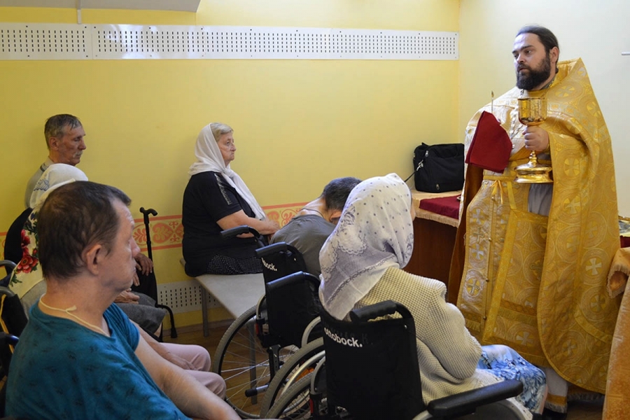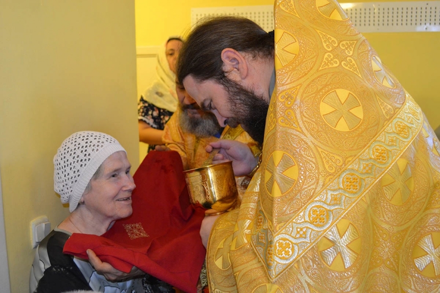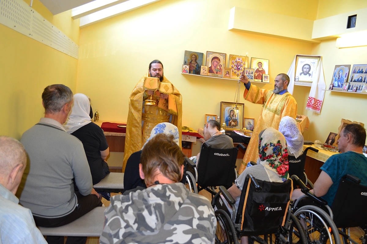 В специально обустроенной для соборной молитвы комнате отец Илия совершил Божественную литургию. Пятнадцать постояльцев социального учреждения причастились Святых Христовых Таин.
