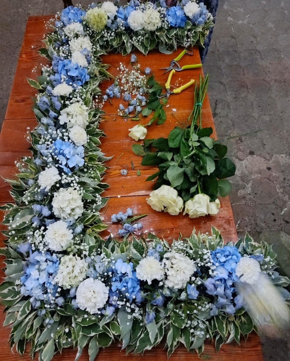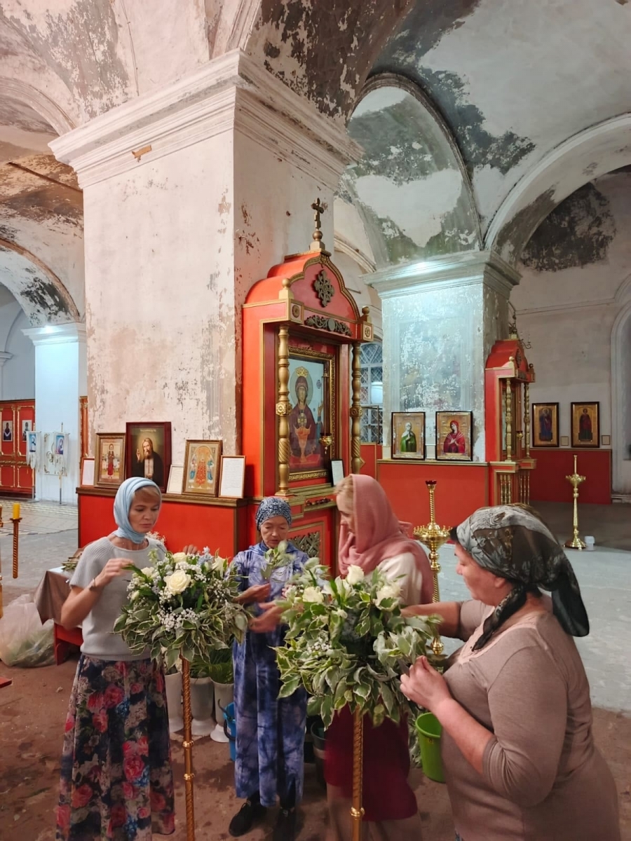 Прихожане храма украшают цветами плащаницу Пресвятой Богородицы и главную икону Спасского собора, именуемую Спасом Нерукотворным.