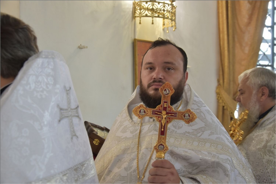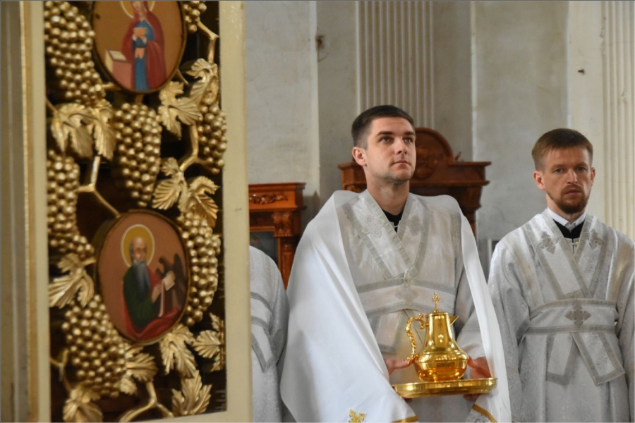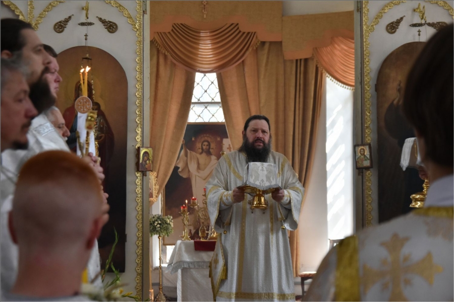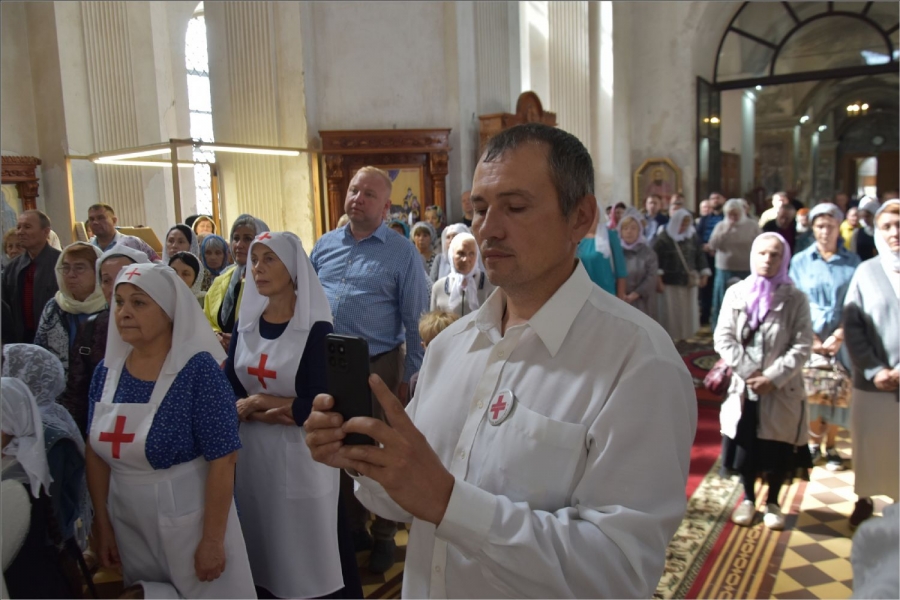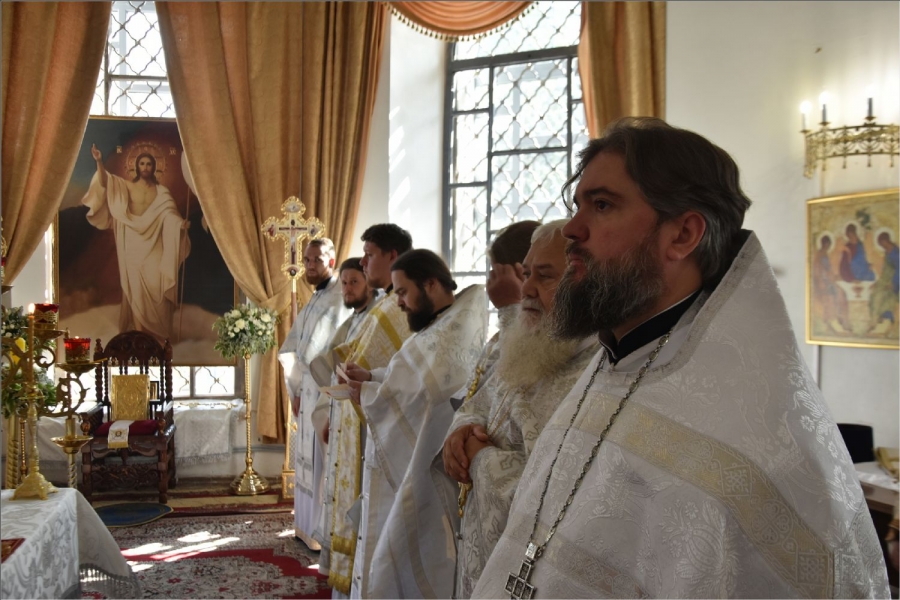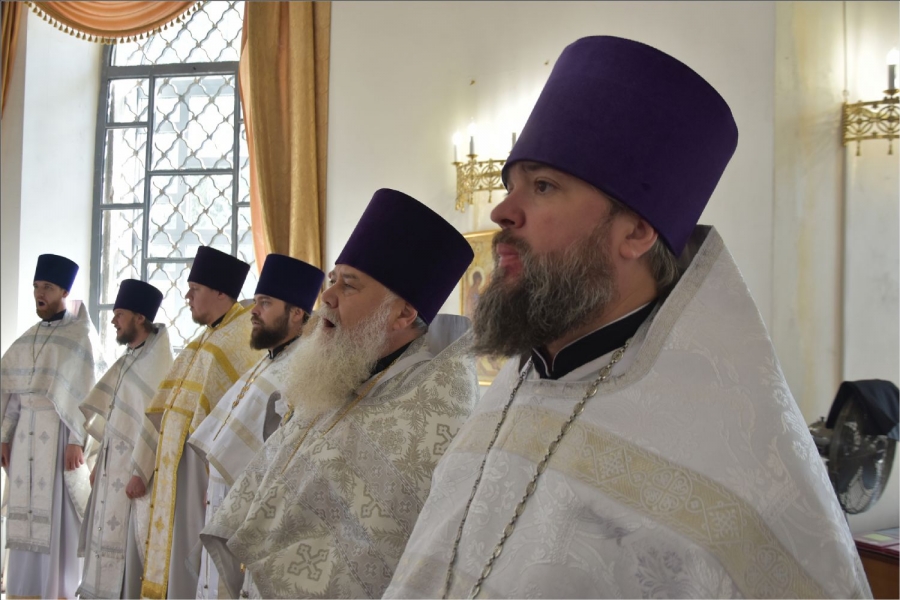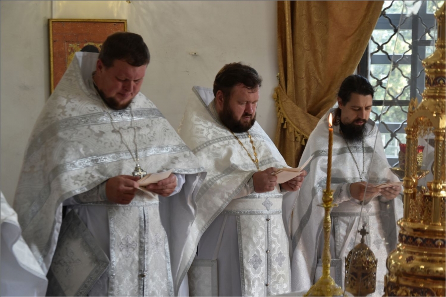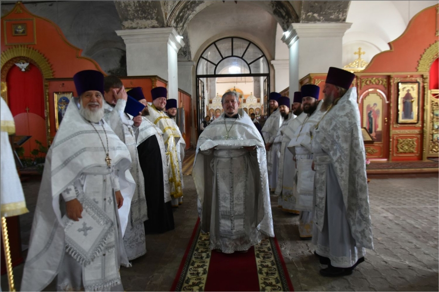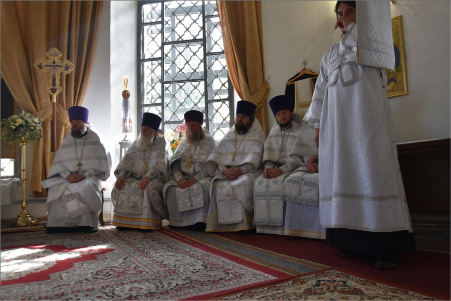 Архипастырю сослужили секретарь Набережночелнинской епархии протоиерей Андрей Лосык, благочинный Елабужского церковного округа, настоятель Спасского собора города Елабуги иеромонах Кирилл (Забавнов), благочинный Закамского церковного округа протоиерей Андрей Дубровин, настоятель храма мученика Уара в селе Икское Устье протоиерей Алексий Загуменнов, настоятель прихода Святой Троицы города Елабуги иерей Илья Кривов, клирик Елабужского монастыря иерей Илья Павлов, ключарь храма Казанской иконы Божией Матери города Набережные Челны иерей Дмитрий Веретнов, настоятель храма великомученика Георгия Победоносца города Елабуги иерей Артемий Танаев, настоятель храма Трех святителей села Ижевка Менделевского района иерей Александр Миронов, настоятель храма Илии пророка села Котловка Елабужского района иерей Евгений Любимов, клирики Спасского собора иерей Михаил Климов и иерей Роман Лепихин, заштатный клирик Набережночелнинской епархии протоиерей Михаил Гречко, клирик Казанской епархии иерей Владимир Благоверный. Диаконский чин возглавил протодиакон Дмитрий Половников.
