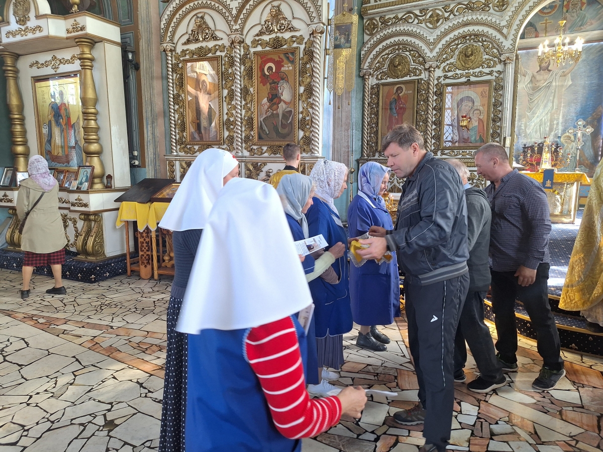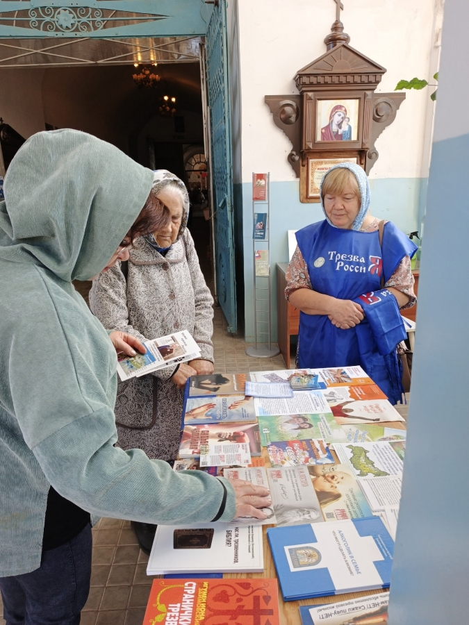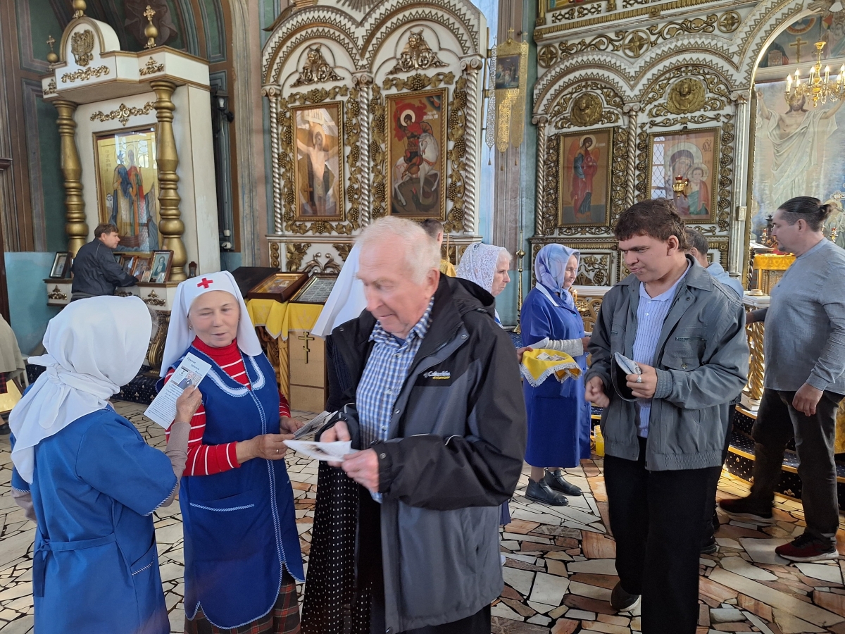 14 сентября, в рамках мероприятий, посвящённых Всероссийскому дню трезвости, на приходе Покровского собора Елабуги сестры милосердия по окончании Божественной Литургии раздали трезвенные листовки прихожанам храма.