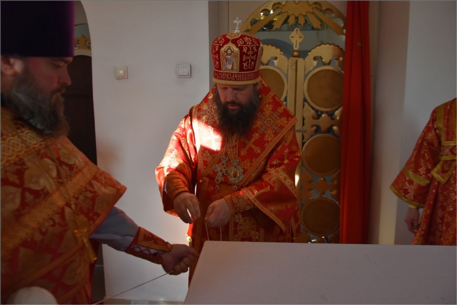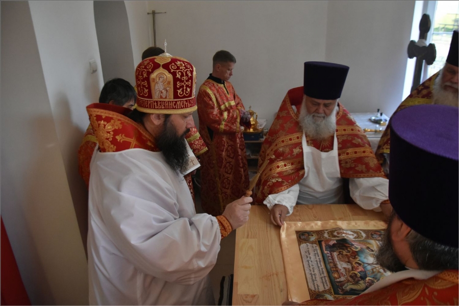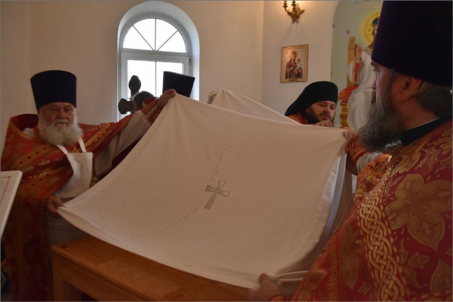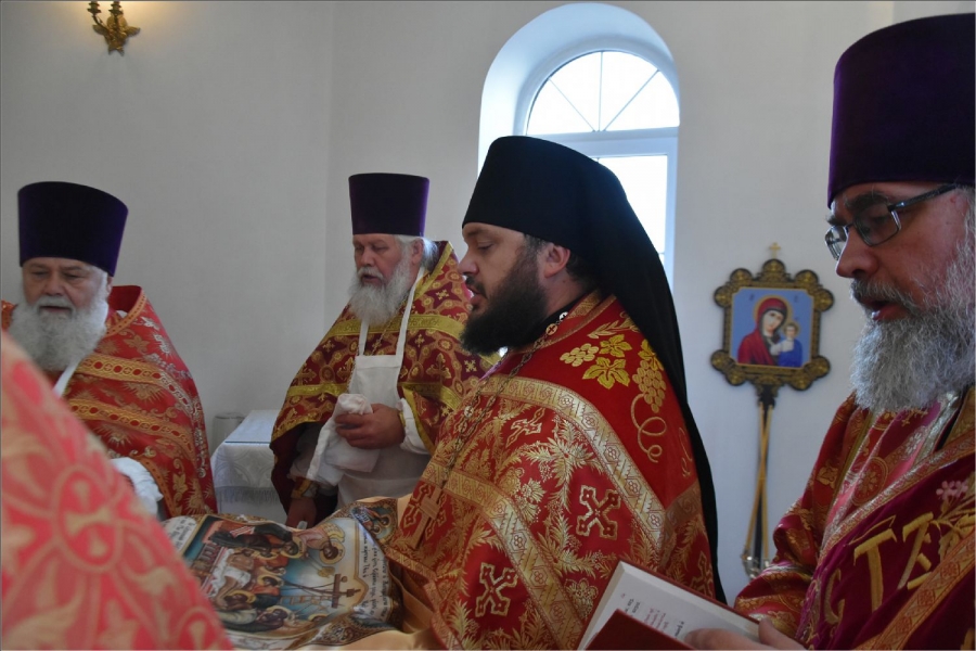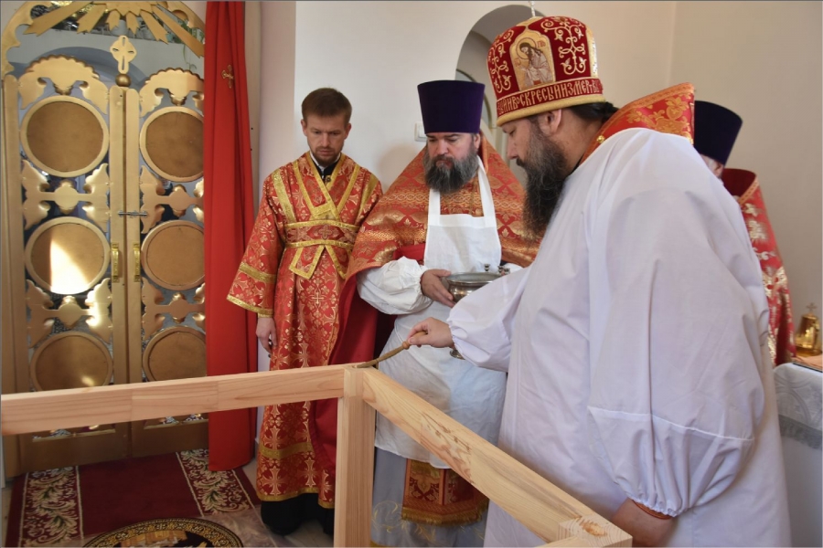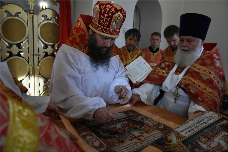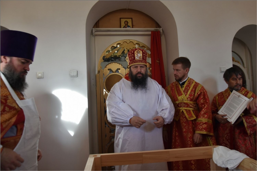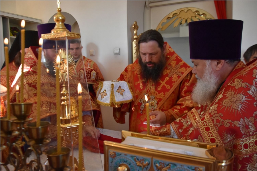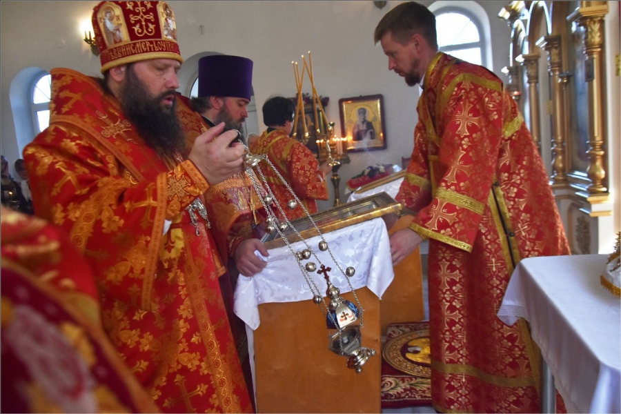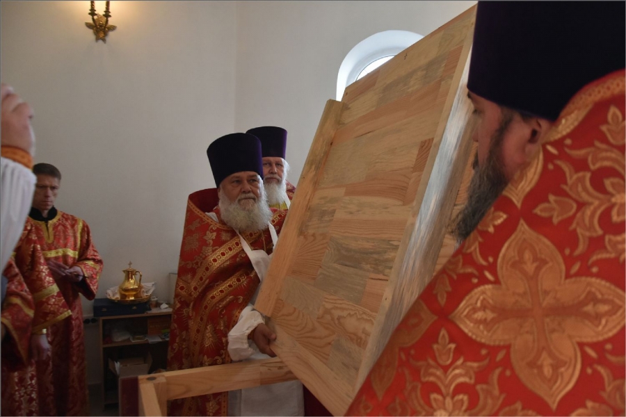 Вокруг храма был совершен крестный ход со святыми мощами, которые затем были положены под престол и в антиминс освященного храма.