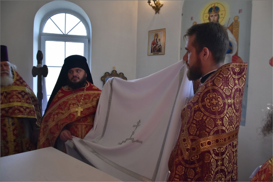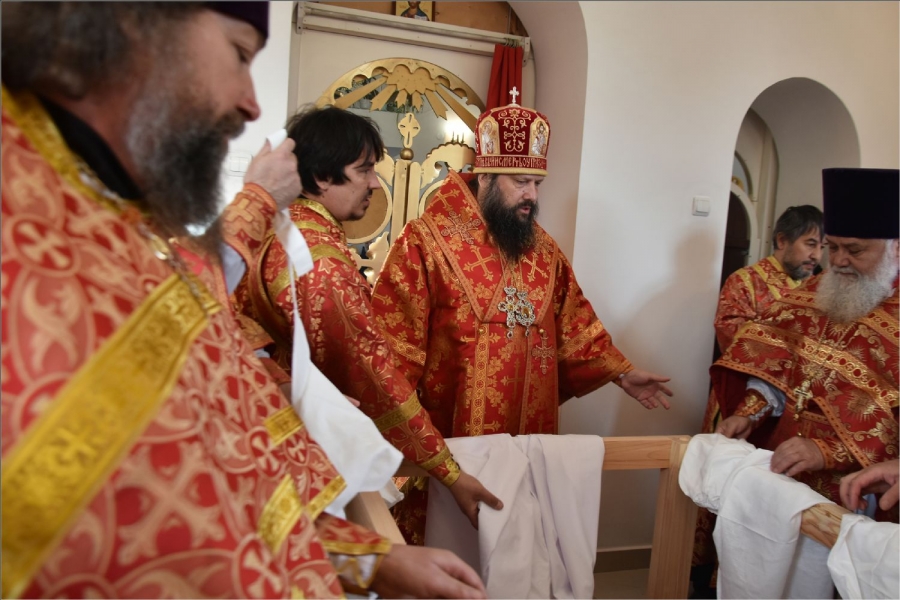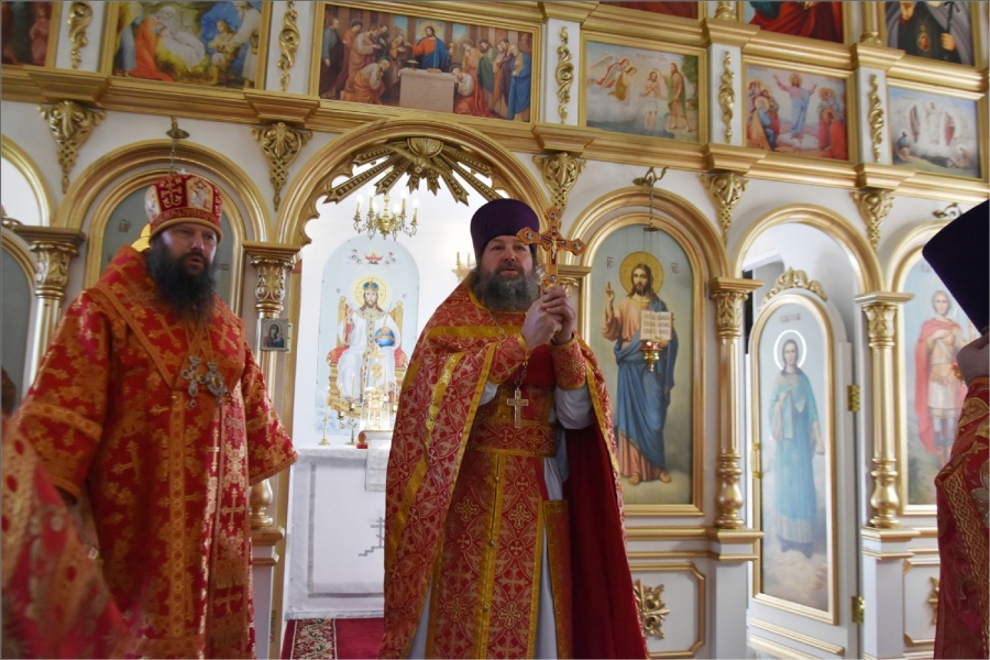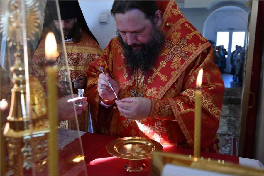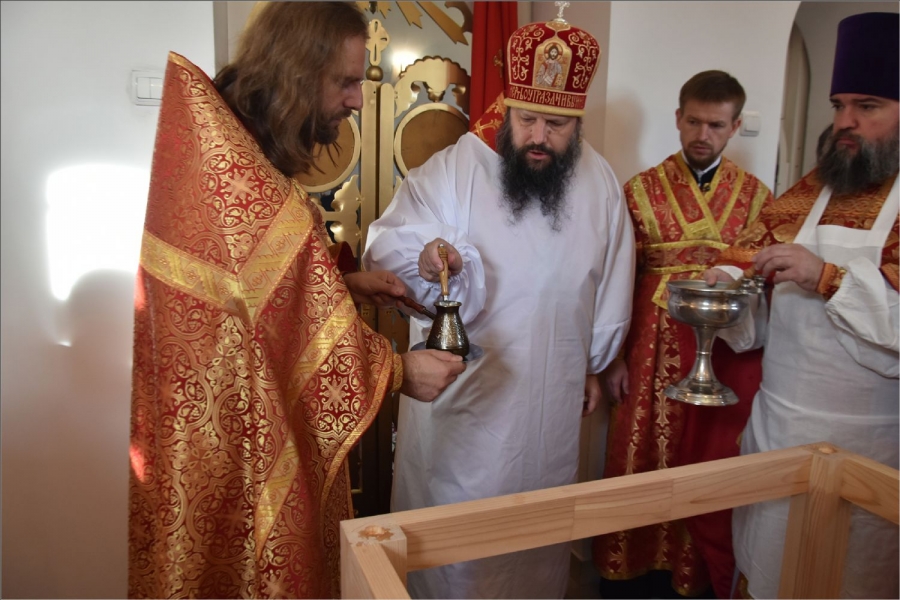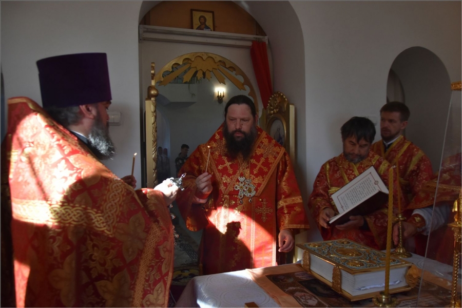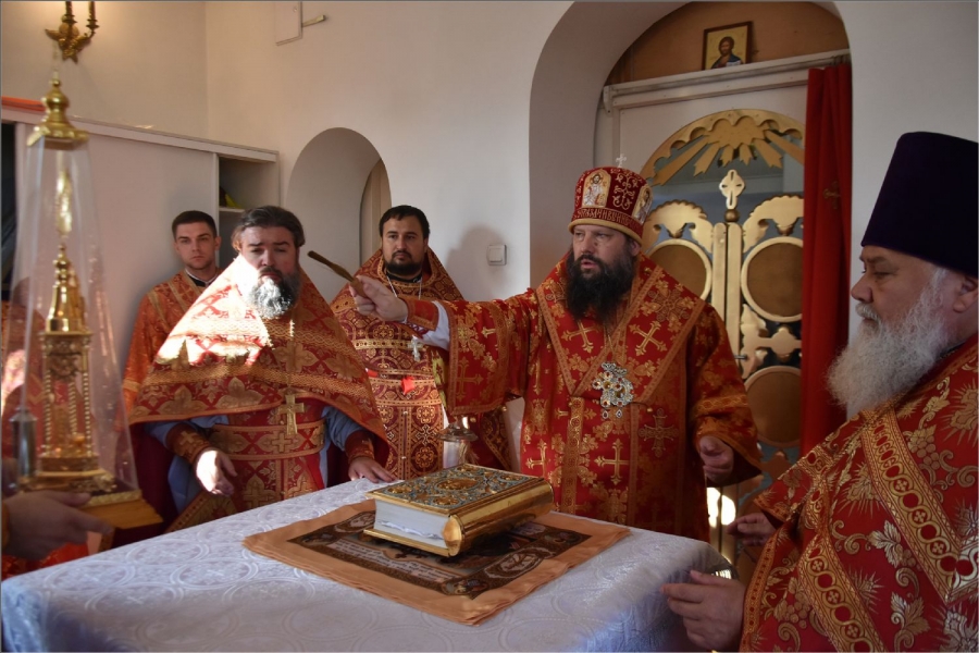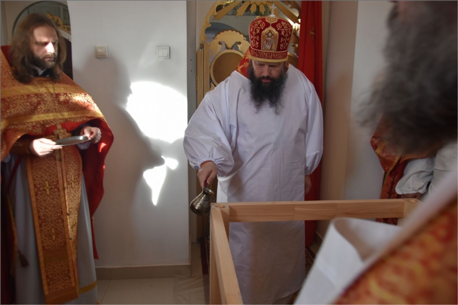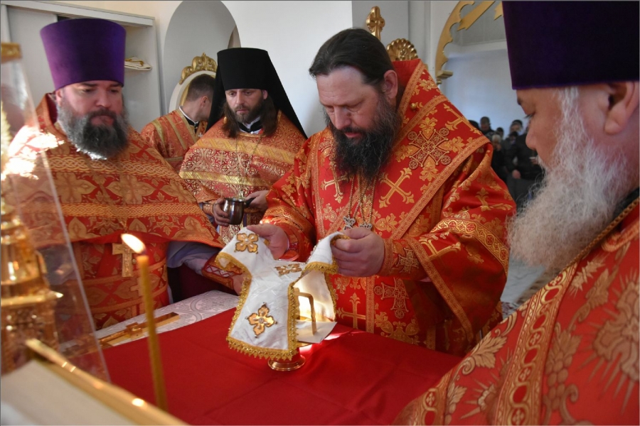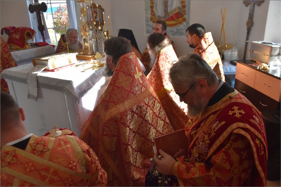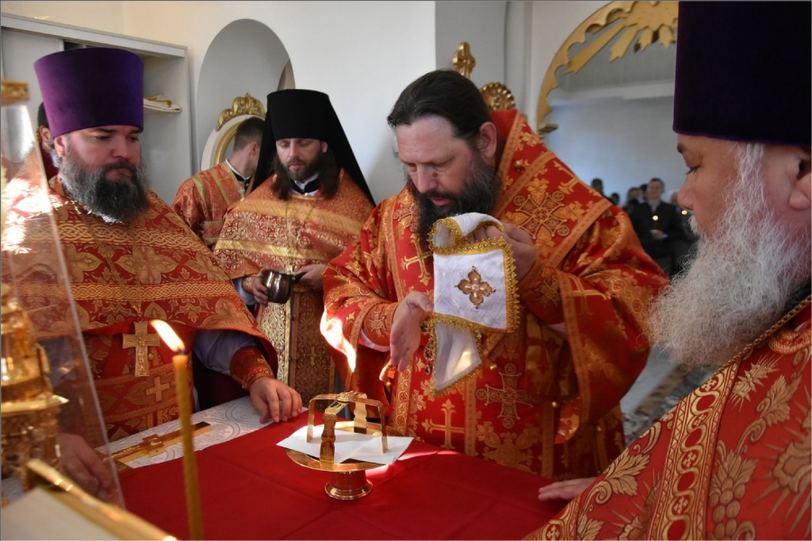 Вокруг храма был совершен крестный ход со святыми мощами, которые затем были положены под престол и в антиминс освященного храма.