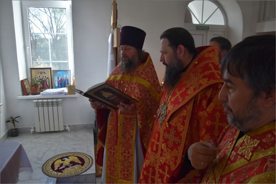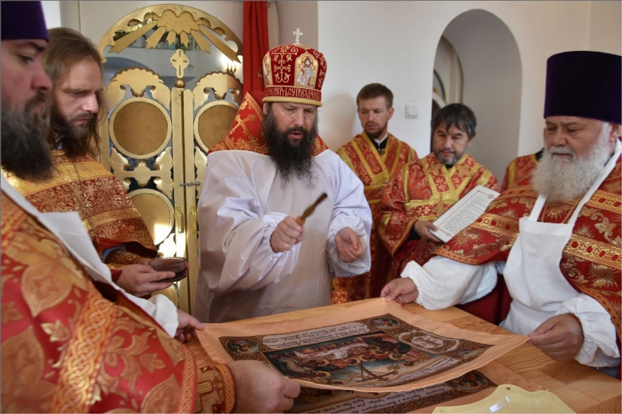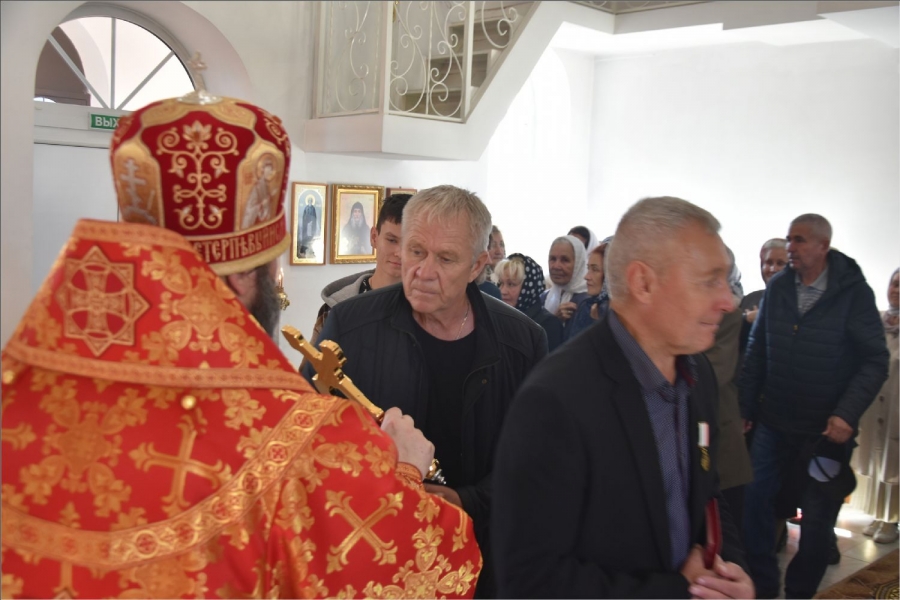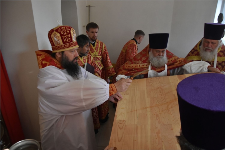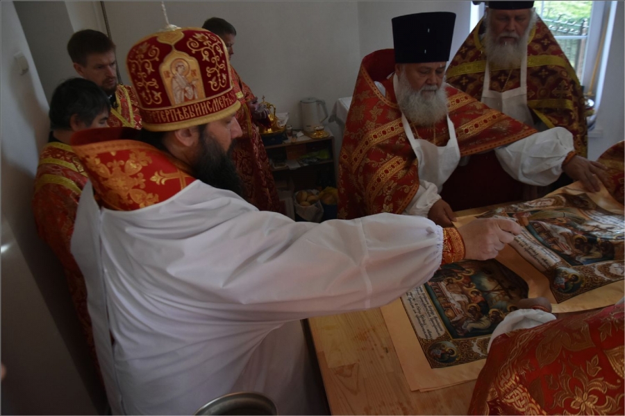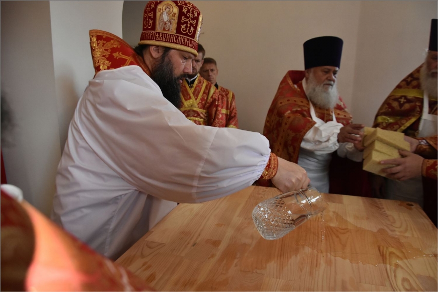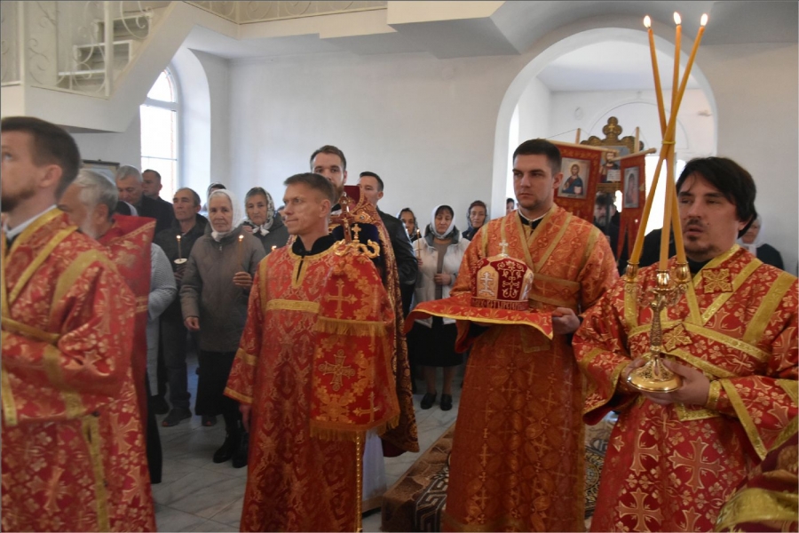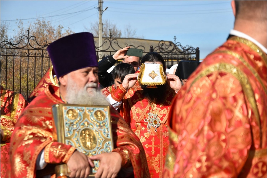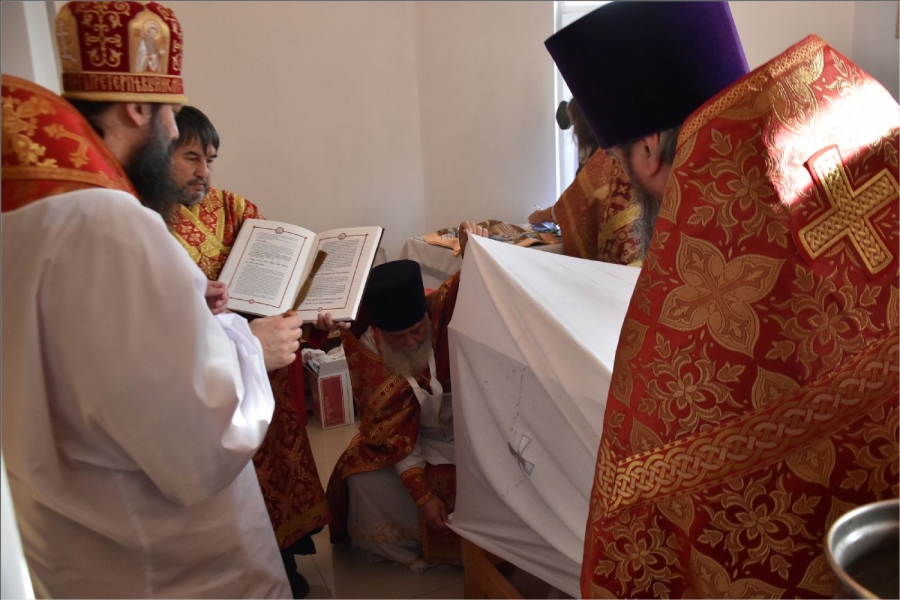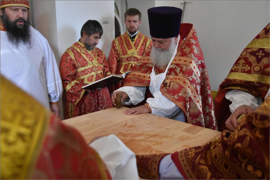 Вокруг храма был совершен крестный ход со святыми мощами, которые затем были положены под престол и в антиминс освященного храма.