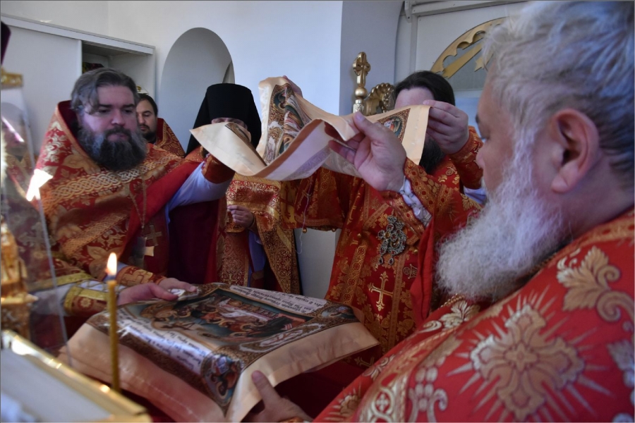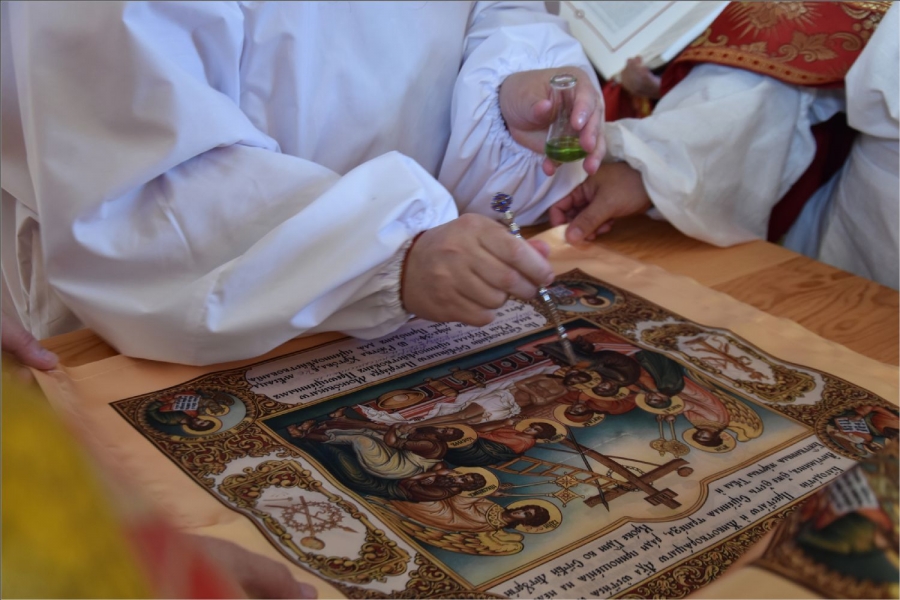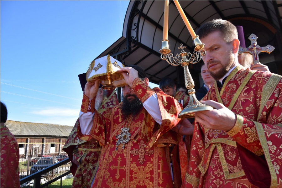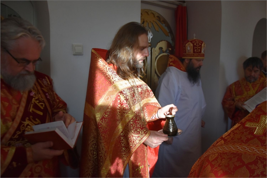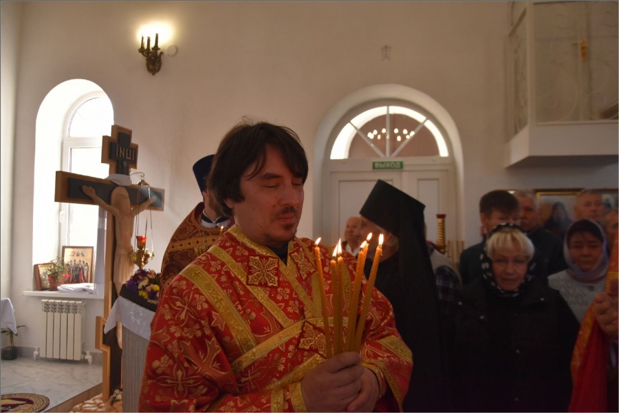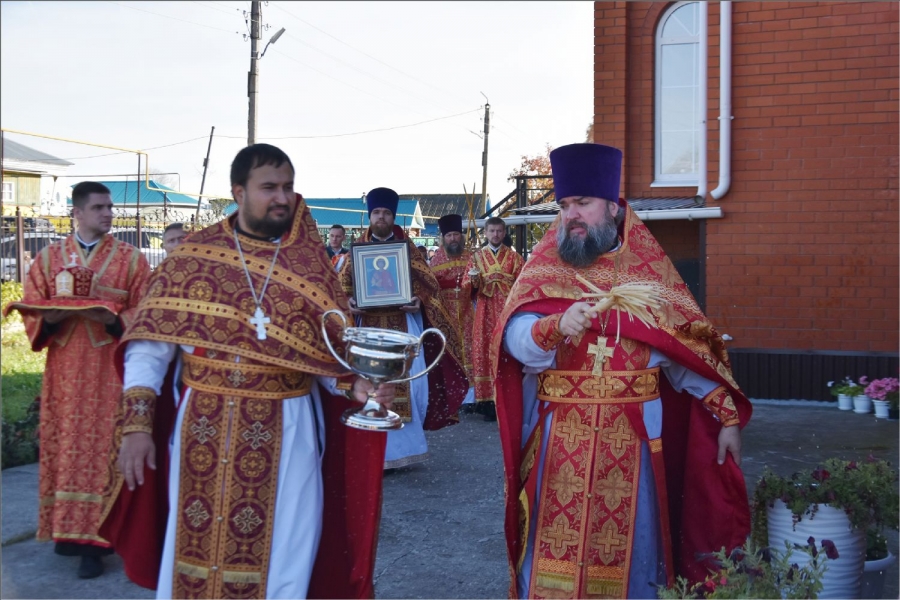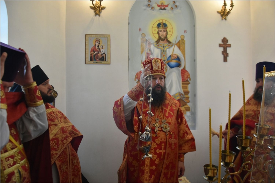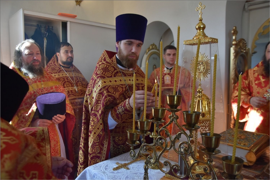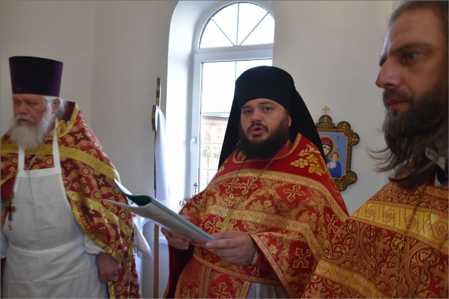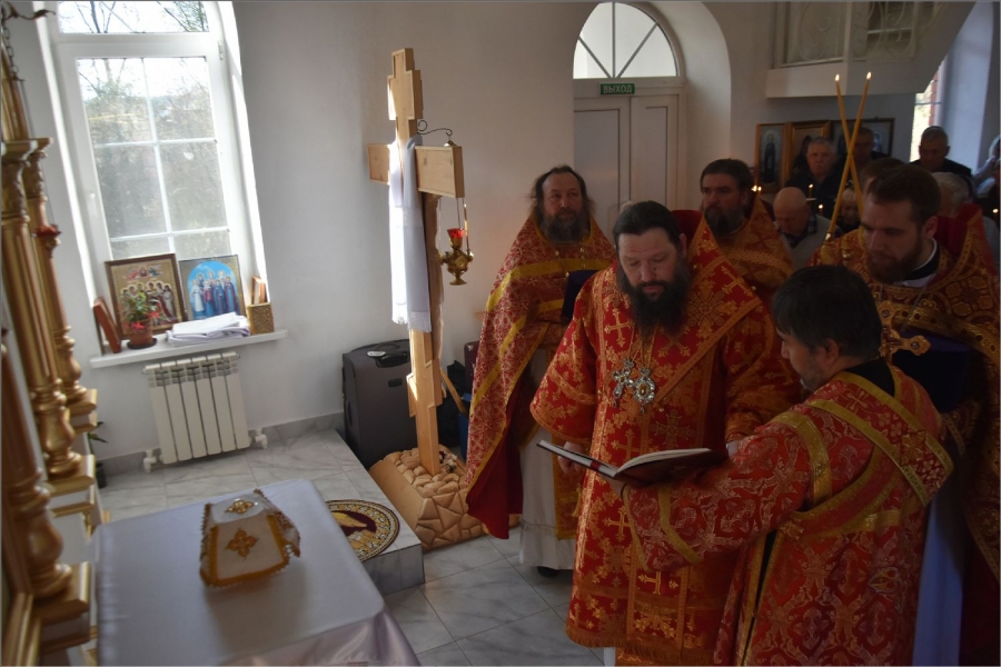 Вокруг храма был совершен крестный ход со святыми мощами, которые затем были положены под престол и в антиминс освященного храма.