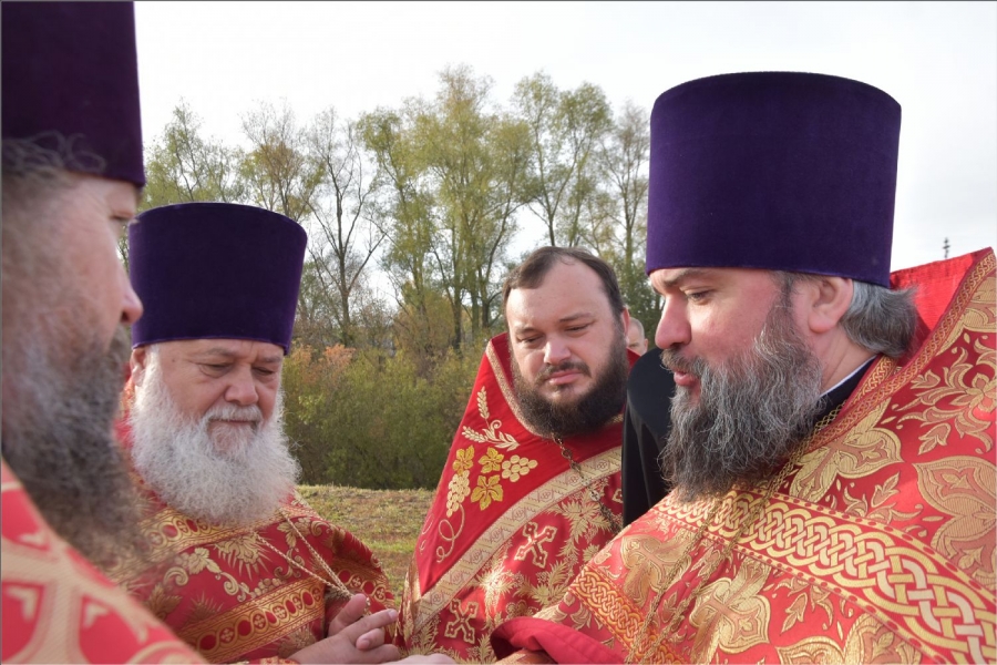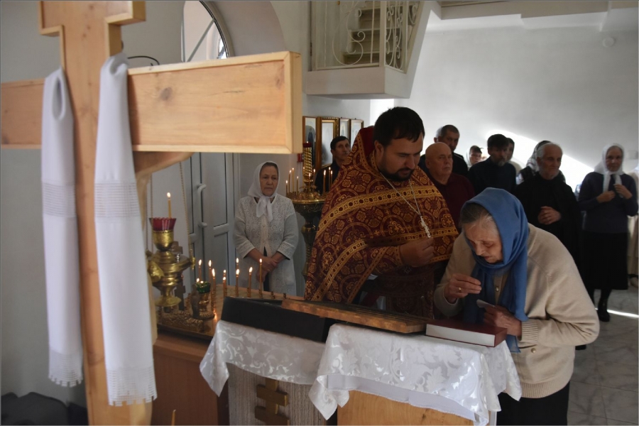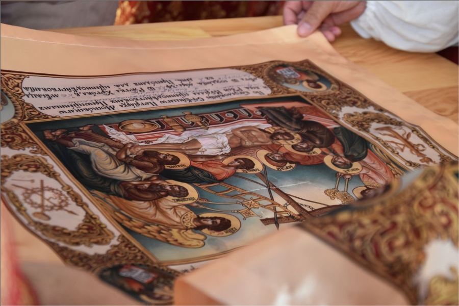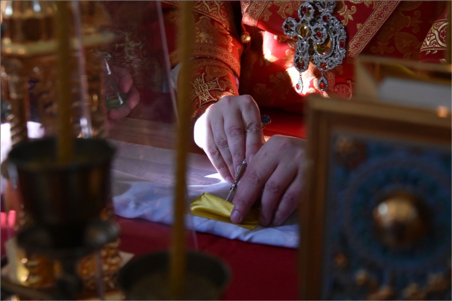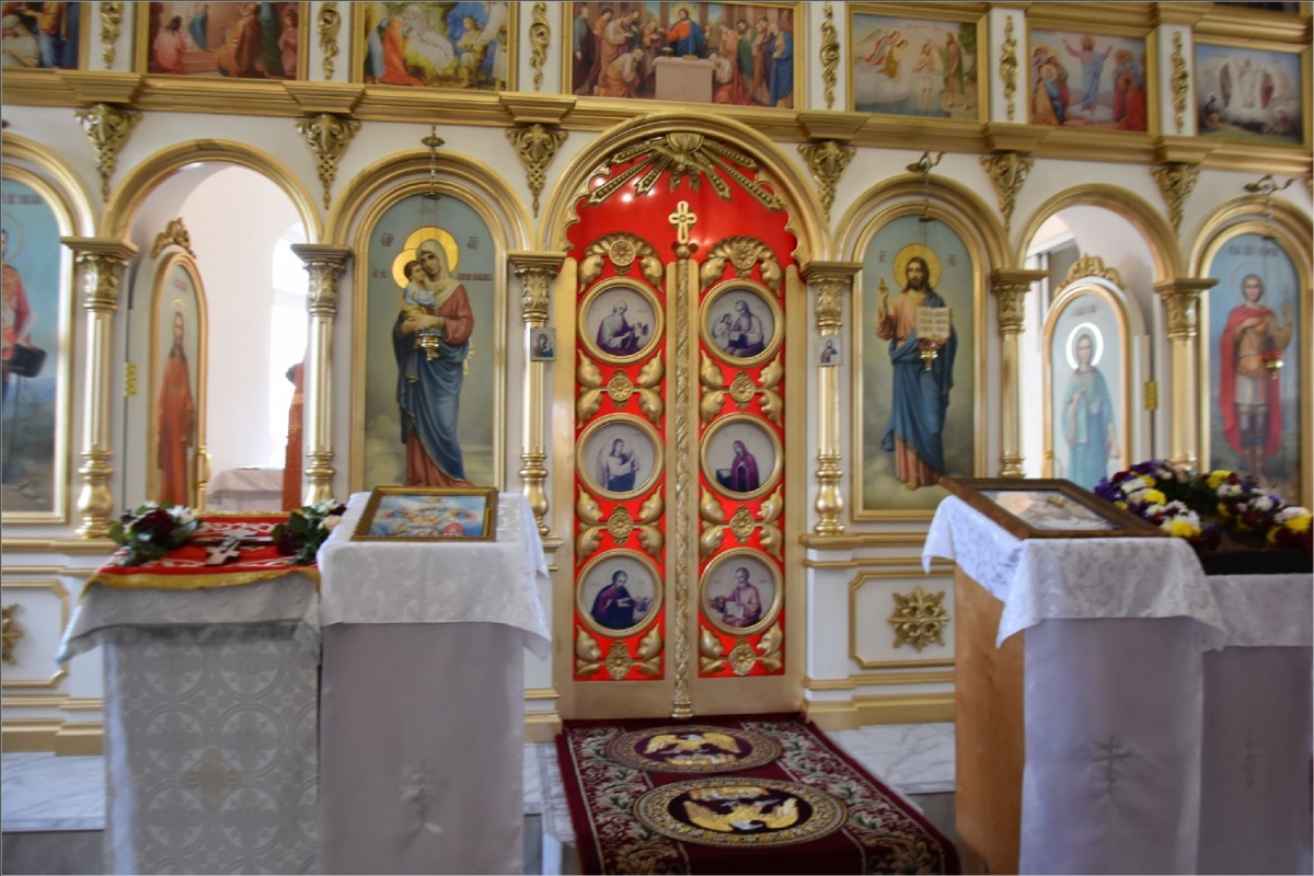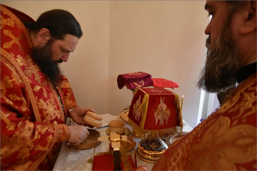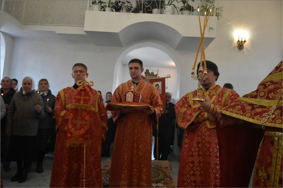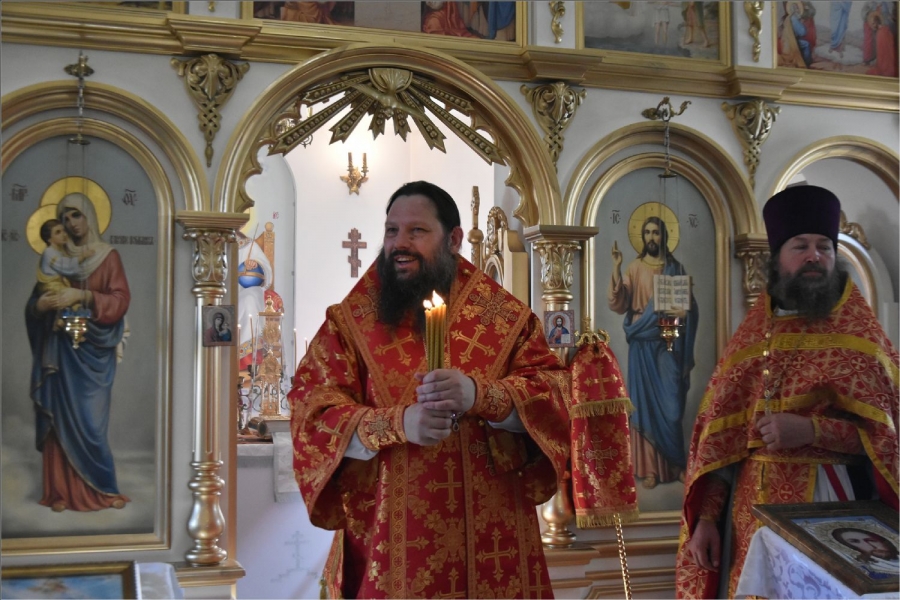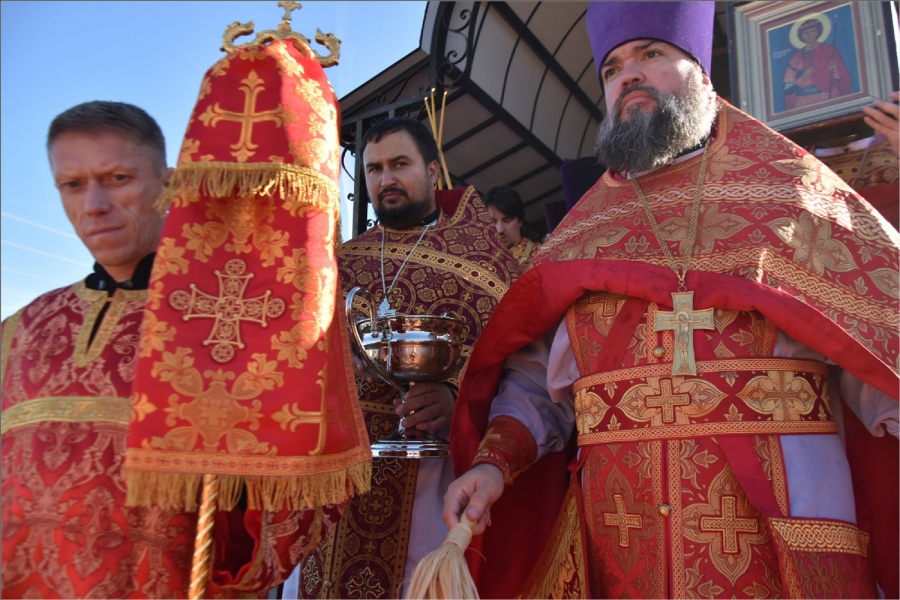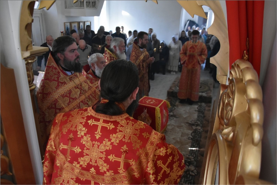 Вокруг храма был совершен крестный ход со святыми мощами, которые затем были положены под престол и в антиминс освященного храма.