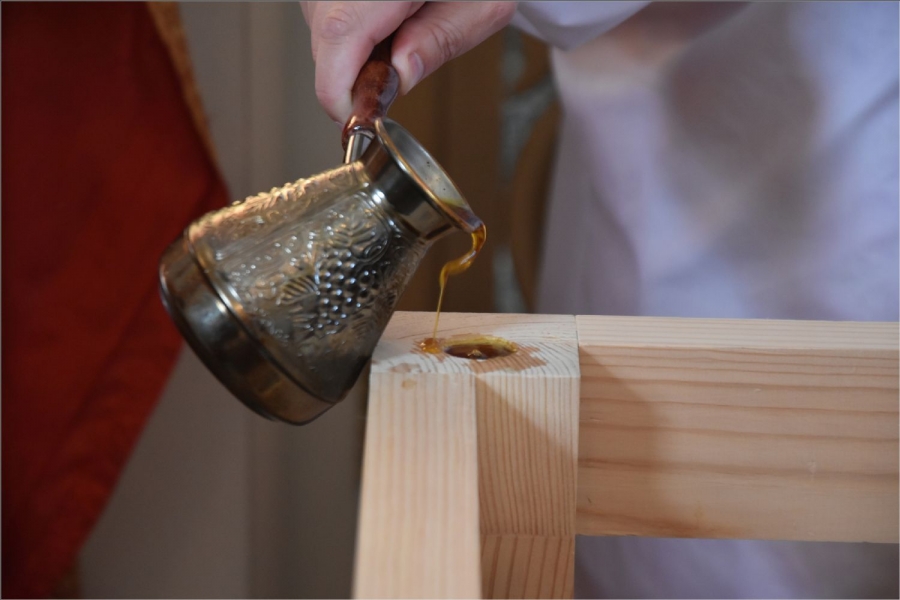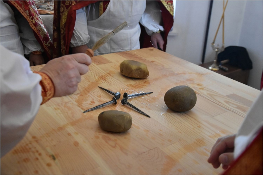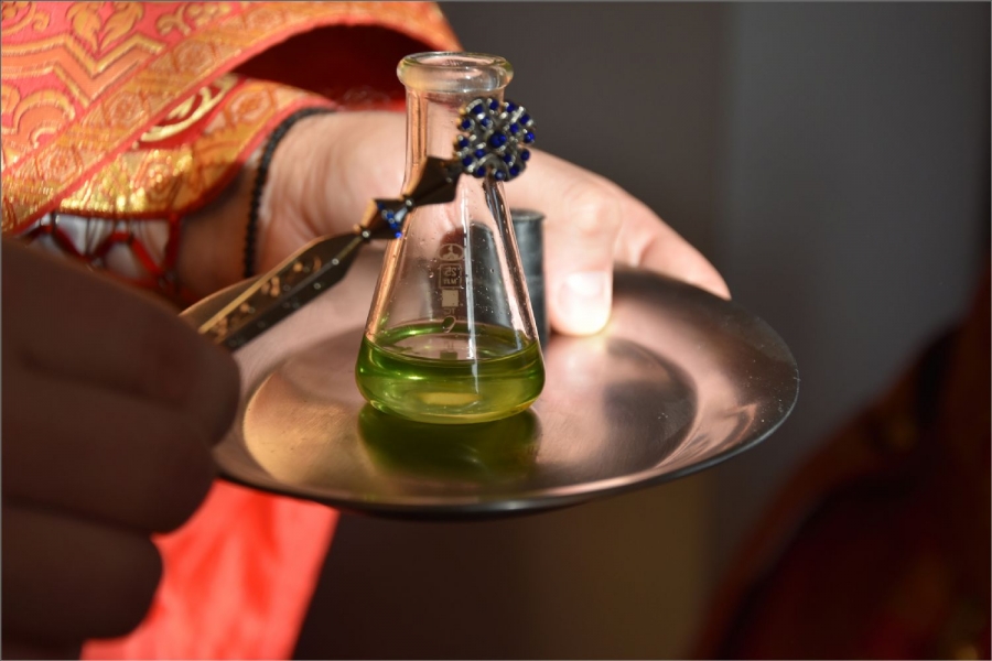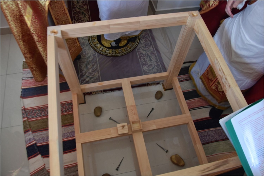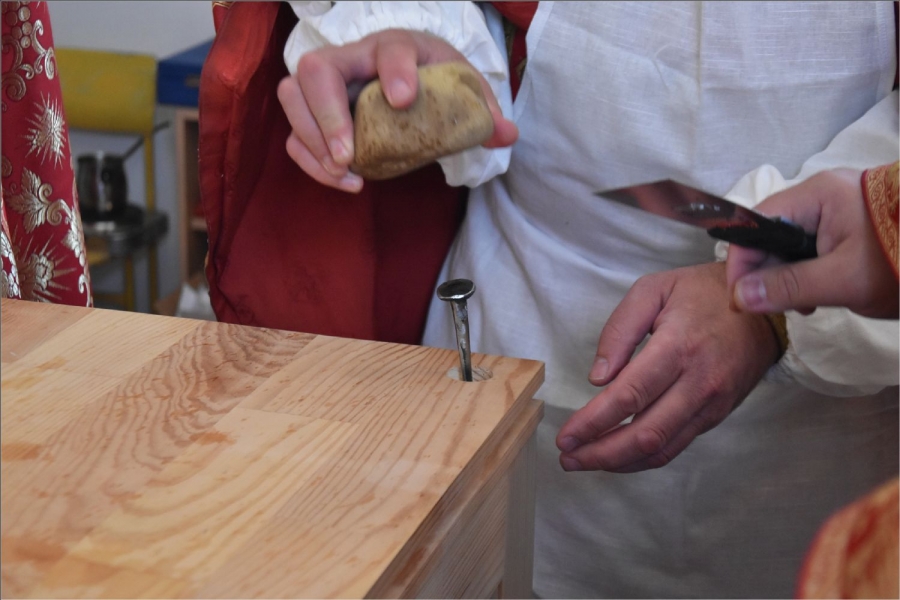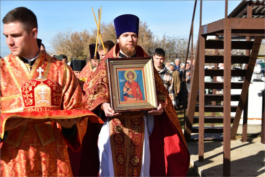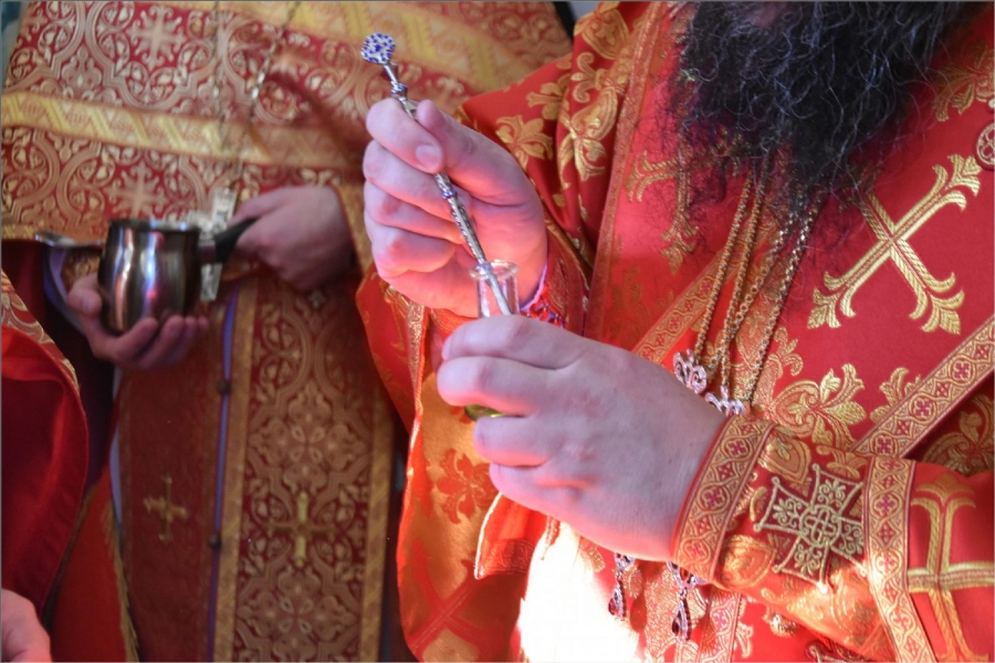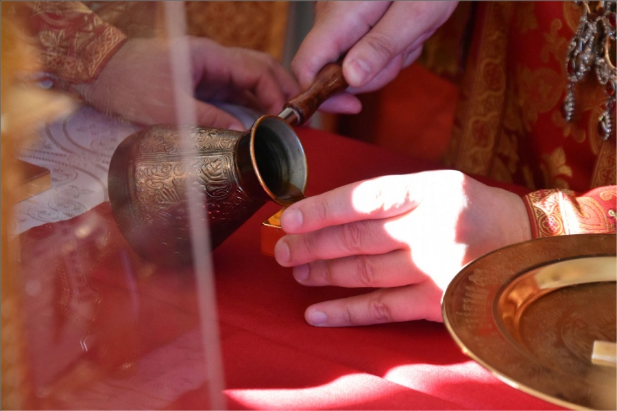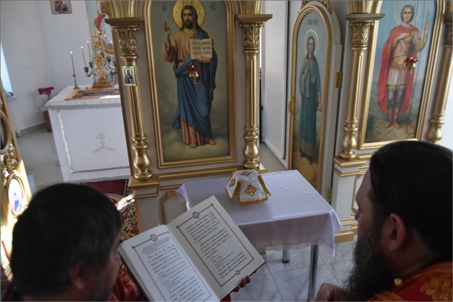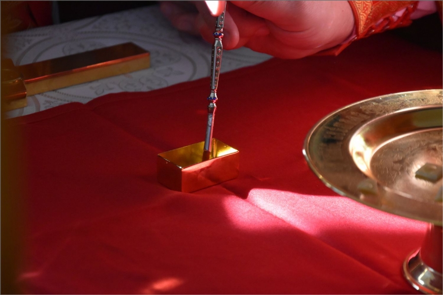 Вокруг храма был совершен крестный ход со святыми мощами, которые затем были положены под престол и в антиминс освященного храма.