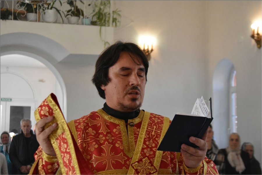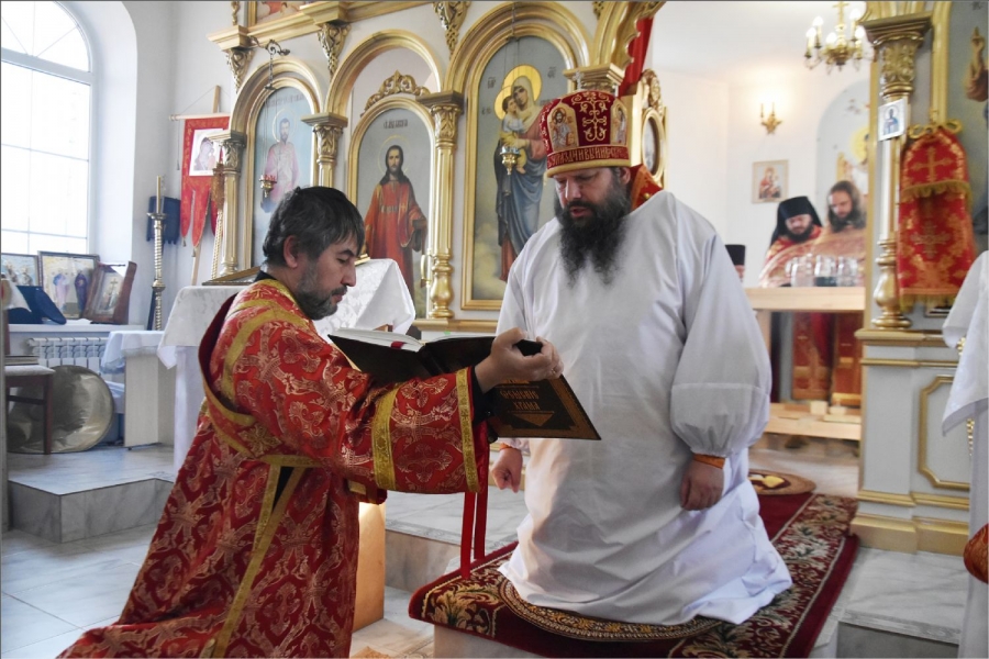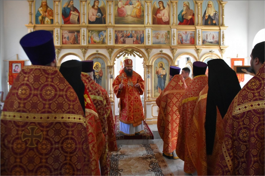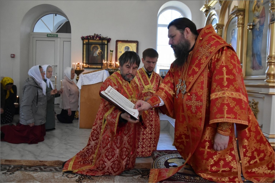 Архиерею сослужили секретарь Набережночелнинской епархии протоиерей Андрей Лосык, благочинный Елабужского округа иеромонах Кирилл (Забавнов), благочинный Закамского округа протоиерей Андрей Дубровин, настоятель храма великомученика Георгия Победоносца села Старое Гришкино протоиерей Павел Малышев, руководитель кряшенской миссии, настоятель храма иконы Божией Матери «Неупиваемач Чаша» города Набережные Челны протоиерей Владимир Иванов, настоятель прихода преподобного Серафима Саровского города Набережные Челны иеромонах Амвросий (Степанюк), настоятель прихода Трех святителей села Ижевка Менделеевского района иерей Александр Миронов, клирик храма свв. бесср. Космы и Дамиана города Набережные Челны иерей Сергий Саутин. Диаконский чин возглавил протодиакон Дмитрий Половников. Богослужебные песнопения исполнил архиерейский хор под управлением Натальи Паллаевой.