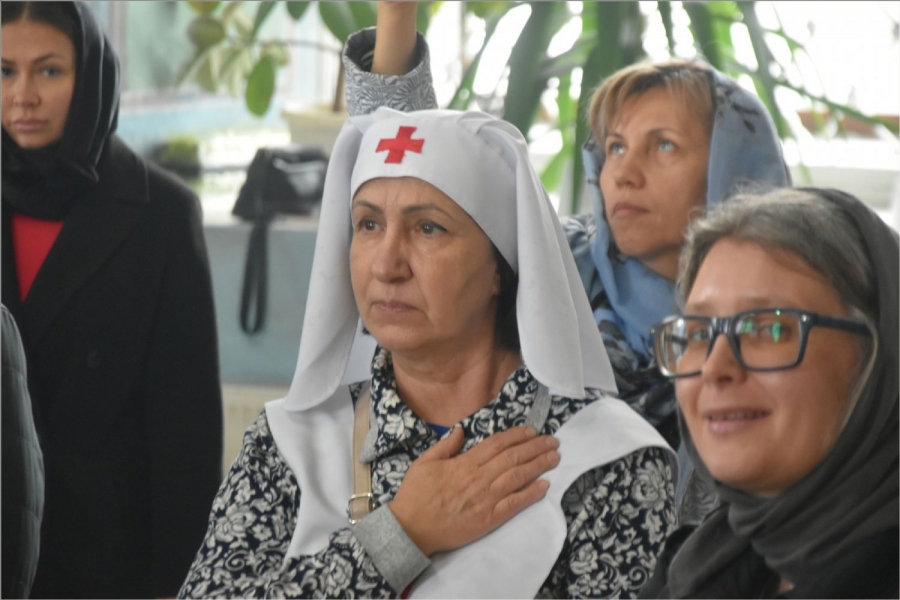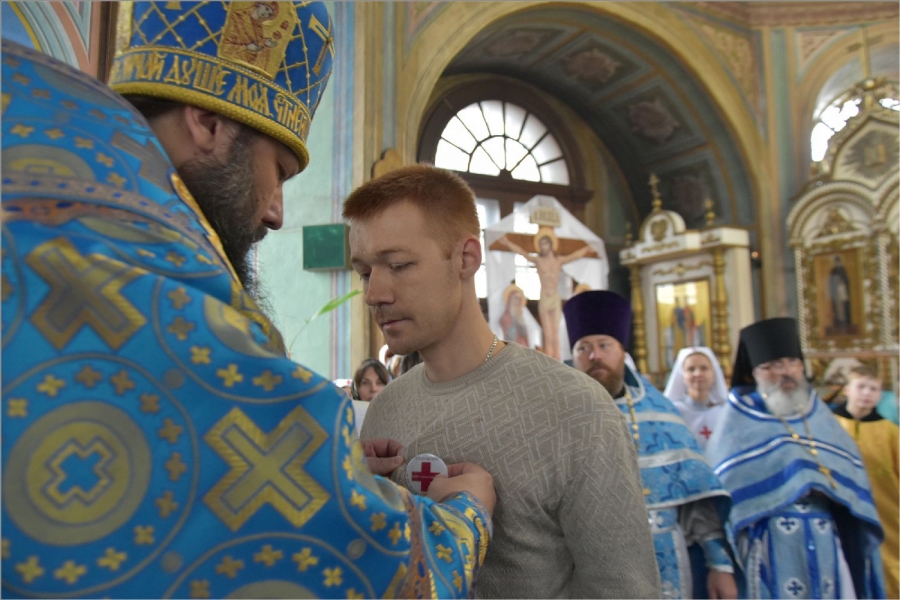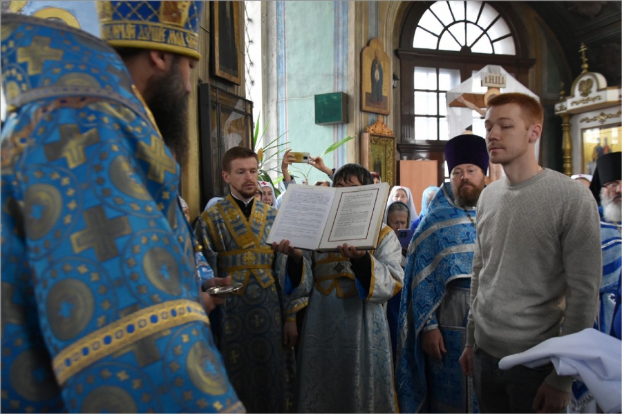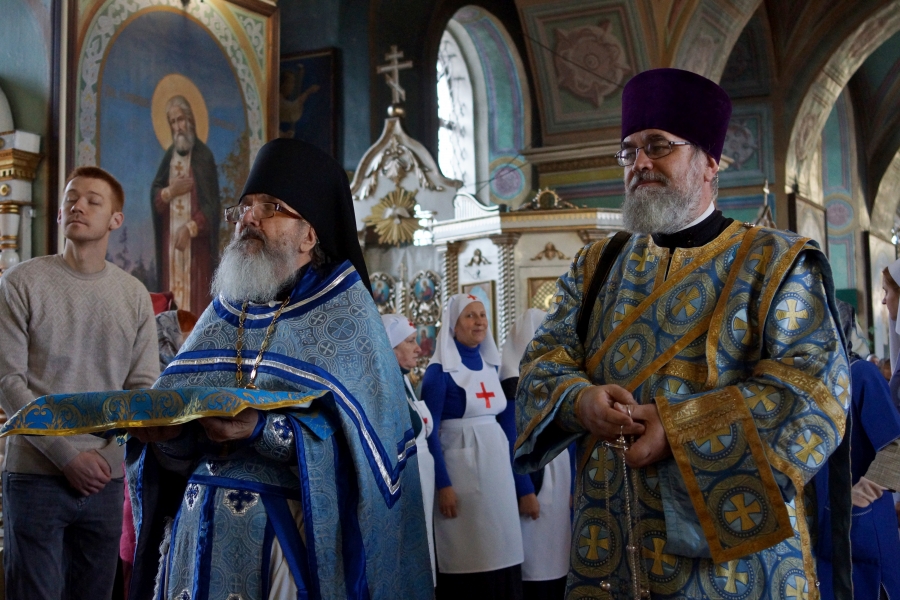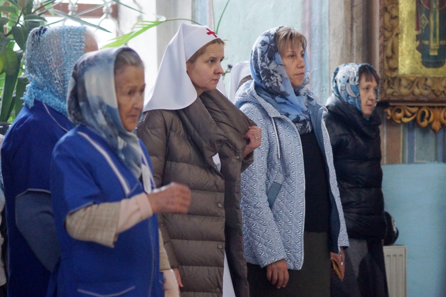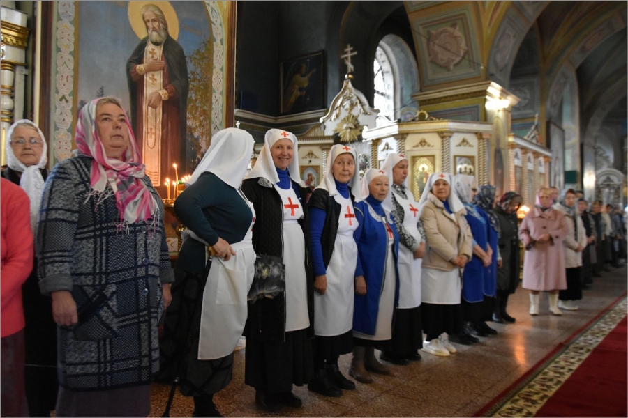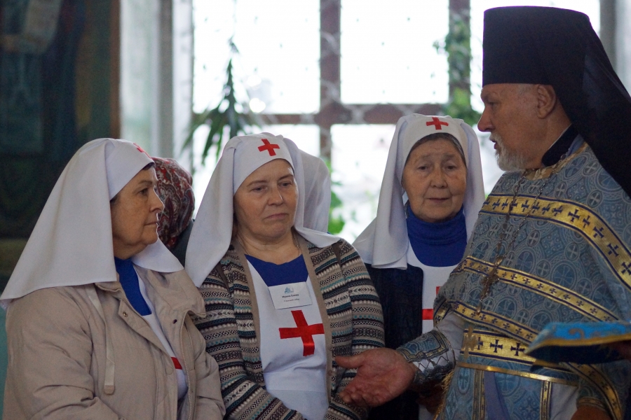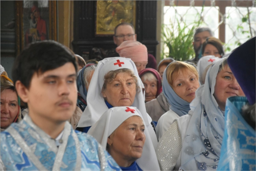 Перед Литургией владыка прочитал молитву на поставление на служение милосердия брату Виталию и кандидату в сестры милосердия сестре Наталье. Владыка сказал, что служение братом милосердия и сестрой милосердия — это большой труд, который можно отчасти сравнить с монашеским. Архипастырь пожелал новым членам Елабужского сестричества доброго служения для людей.