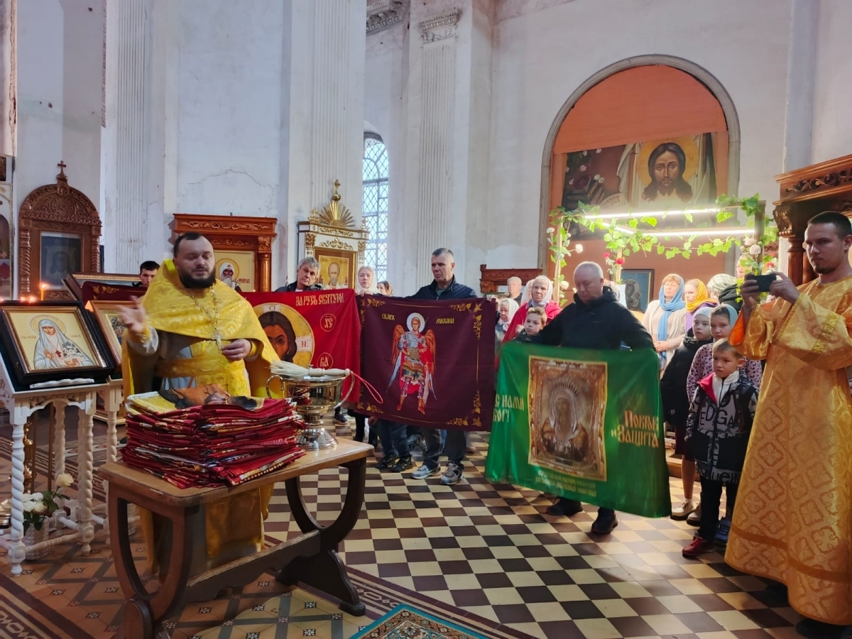 После богослужения иеромонах Кирилл освятил 80 знамён с изображениями святых - покровителей воинов для военных частей.
