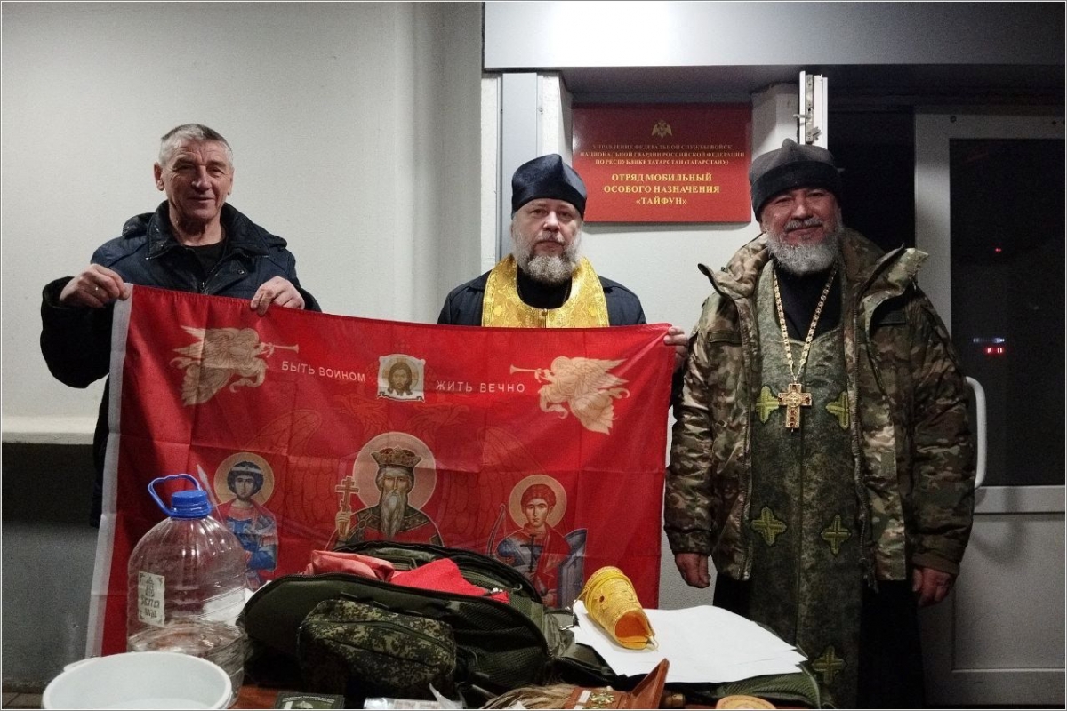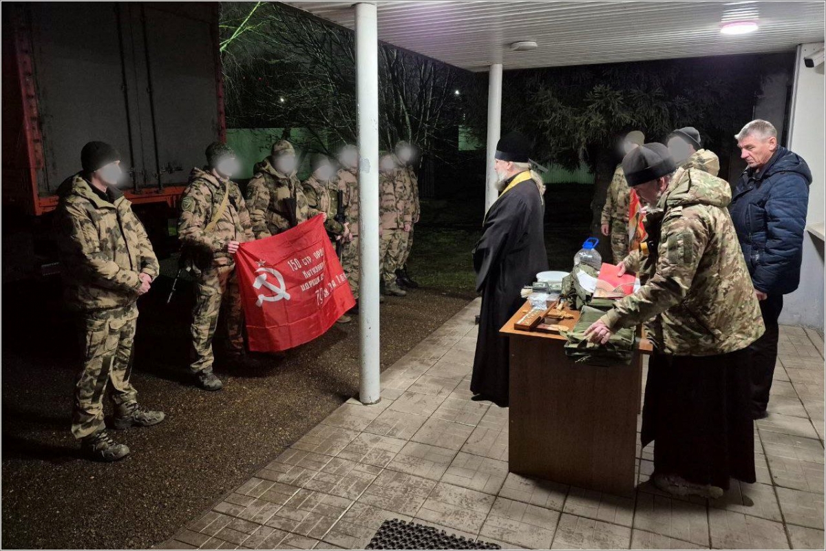 Священники благословили воинов, сказали им напутственные слова, раздали шевроны с изображением Спасителя и святого Александра Невского, каждого бойца окропили святой водой и помазали освященным маслом.