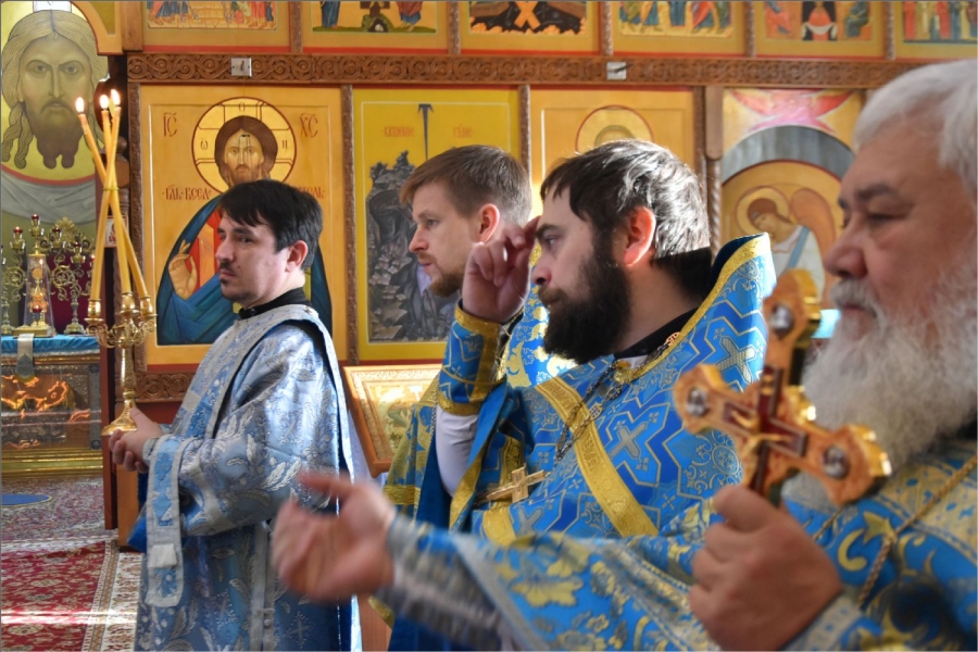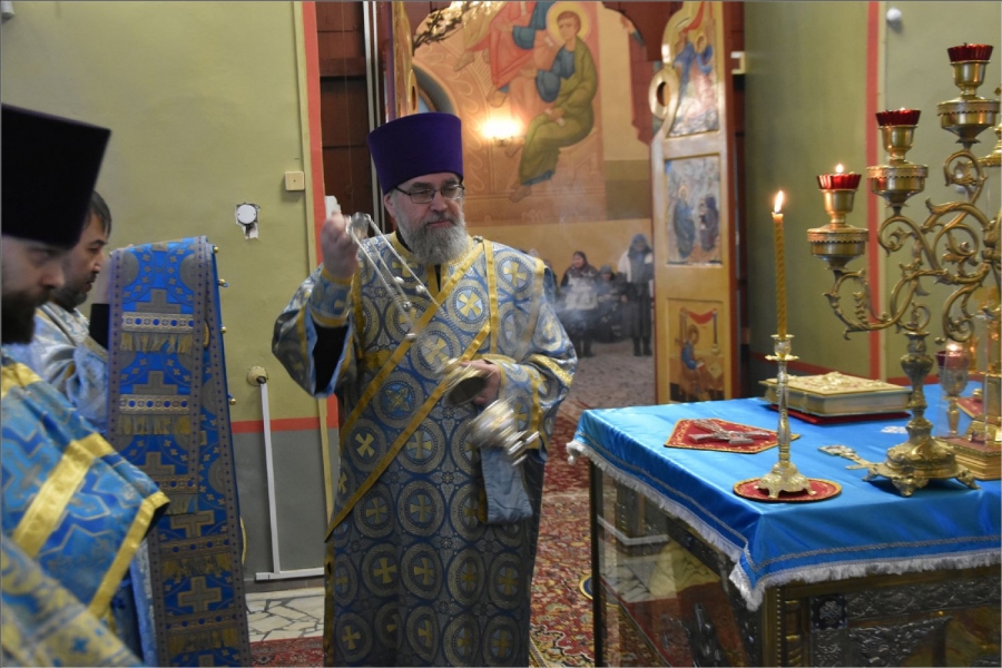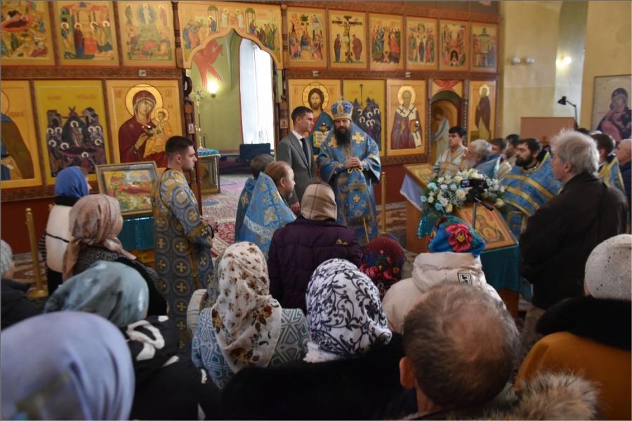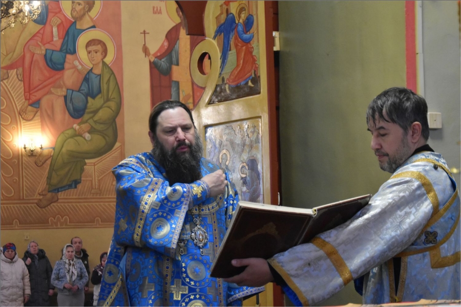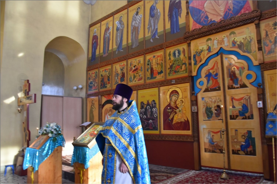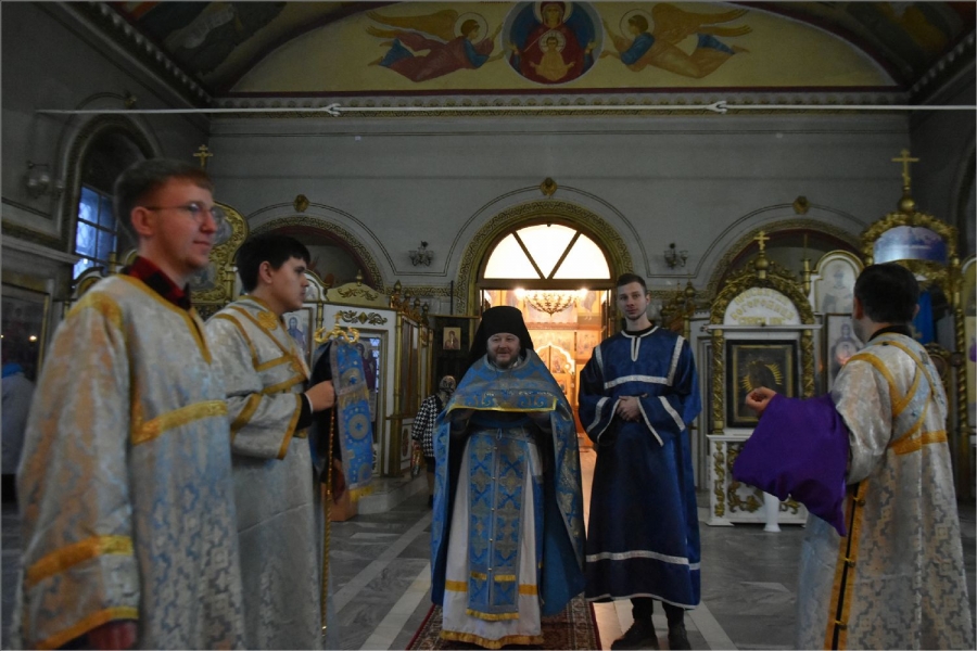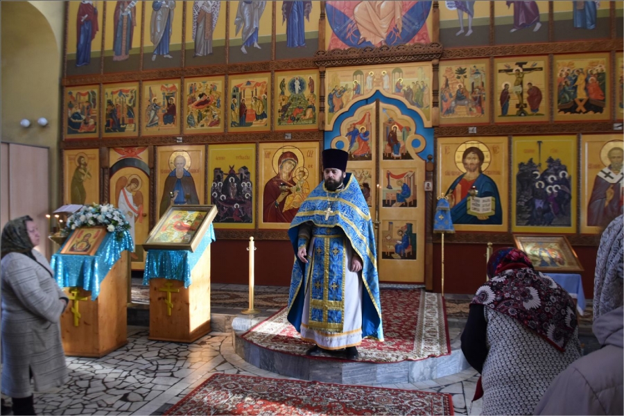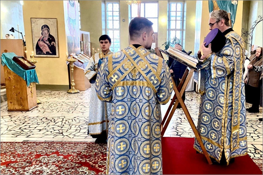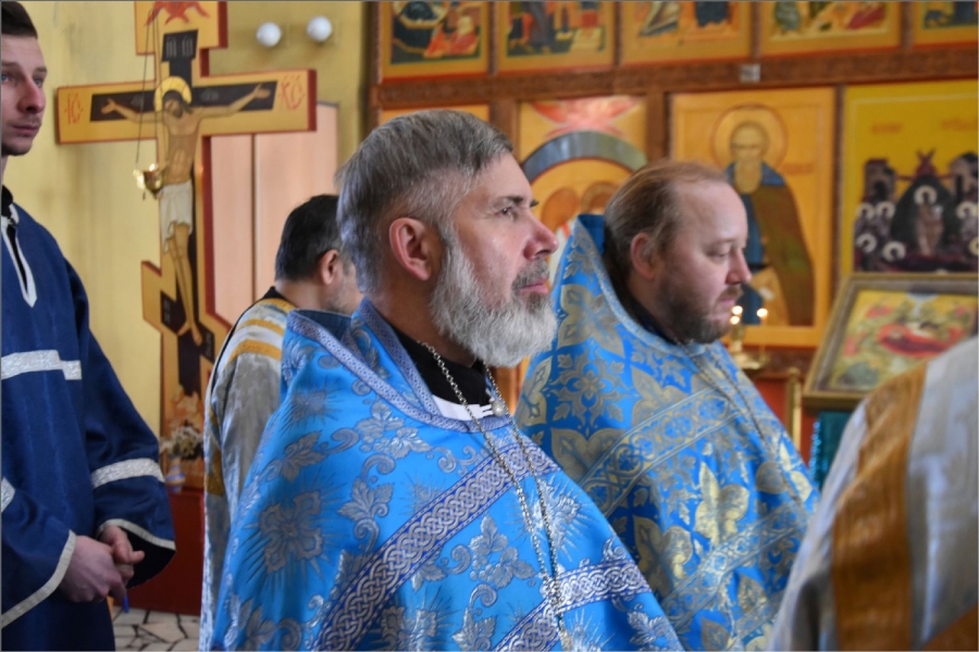 На мирной и сугубой ектениях были вознесены молитвы о Российском воинстве и о мире. Проповедь по запричастном стихе произнес иерей Даниил Кривов. По завершении службы было совершено славление Божией Матери.