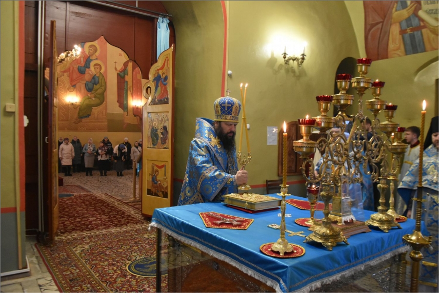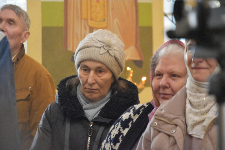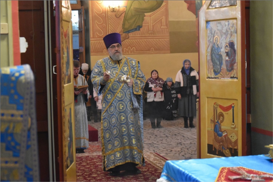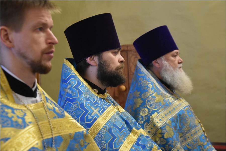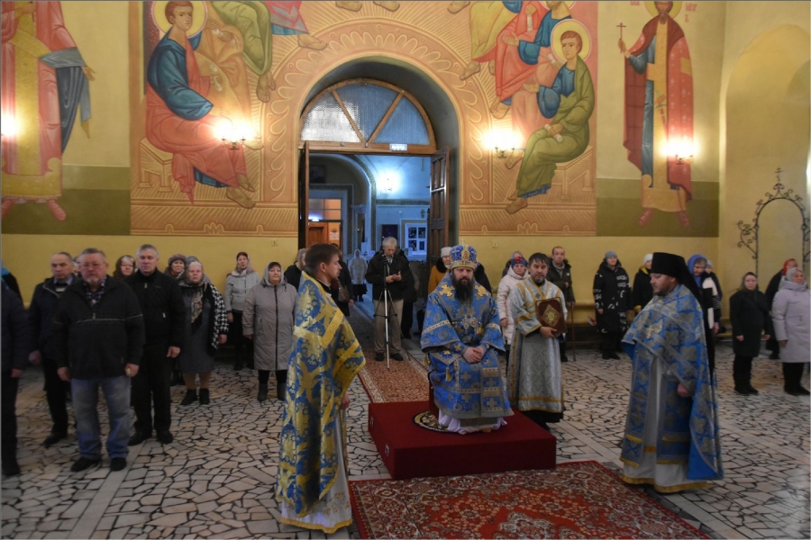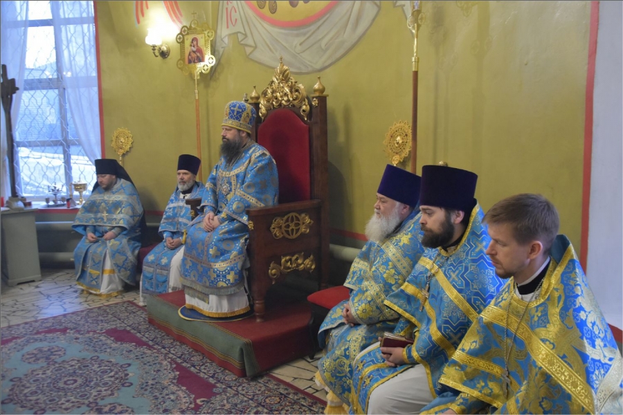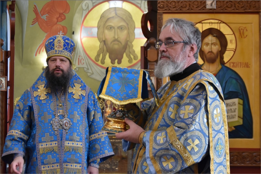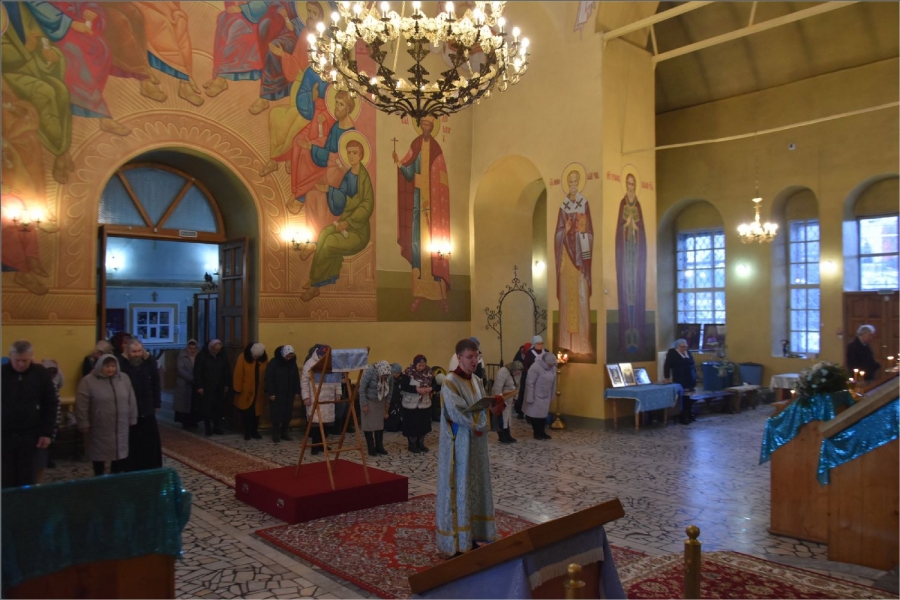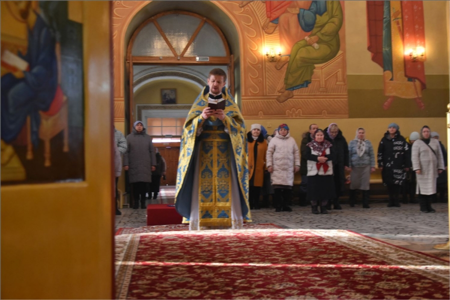 На мирной и сугубой ектениях были вознесены молитвы о Российском воинстве и о мире. Проповедь по запричастном стихе произнес иерей Даниил Кривов. По завершении службы было совершено славление Божией Матери.