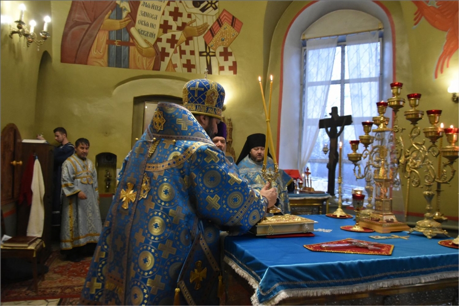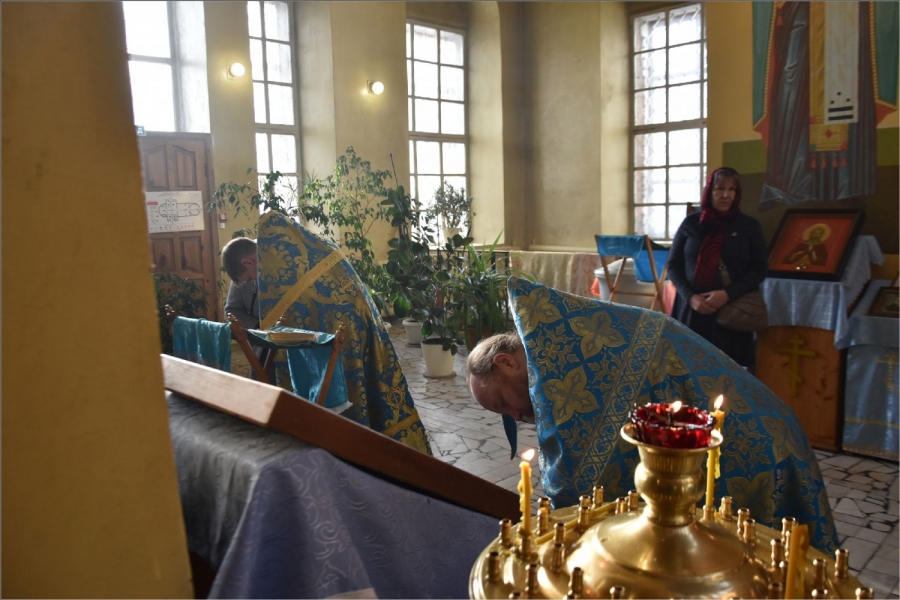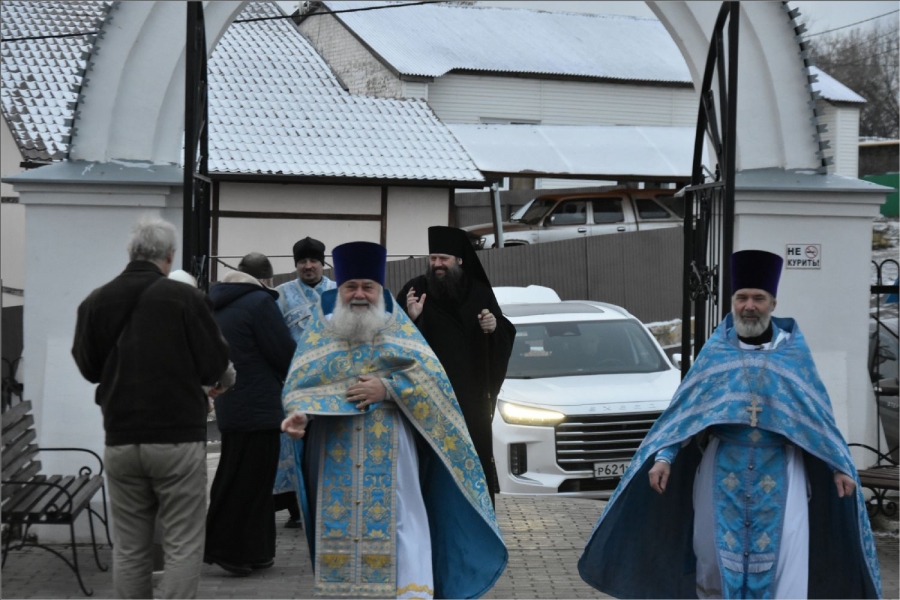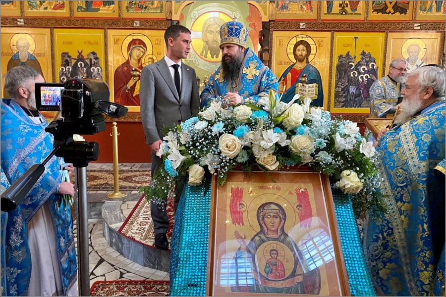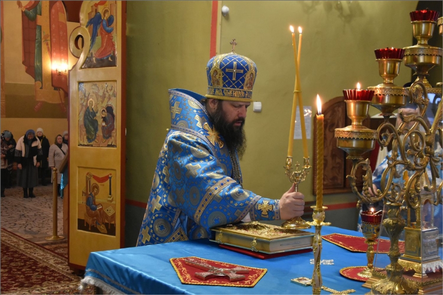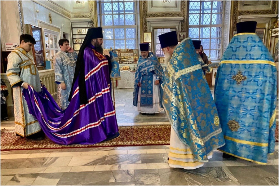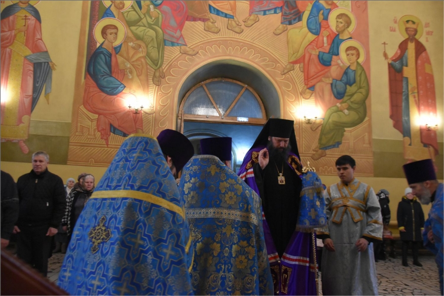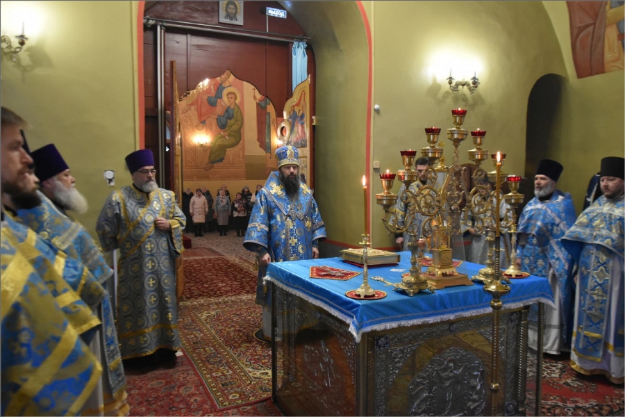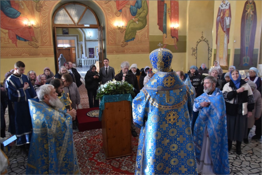 На мирной и сугубой ектениях были вознесены молитвы о Российском воинстве и о мире. Проповедь по запричастном стихе произнес иерей Даниил Кривов. По завершении службы было совершено славление Божией Матери.