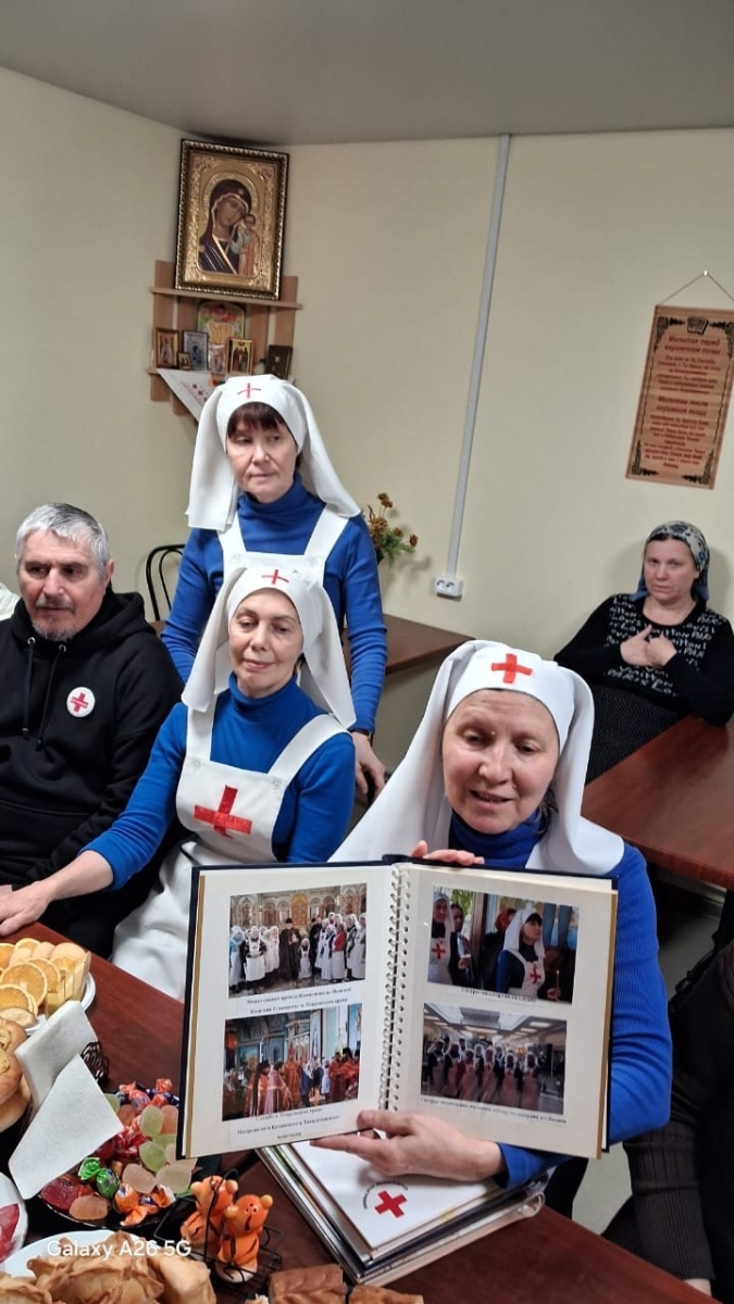 В дружеской беседе за чаепитием руководитель сестричества Лариса Николаевна Гуслистова познакомила гостей с деятельностью общества милосердия.
