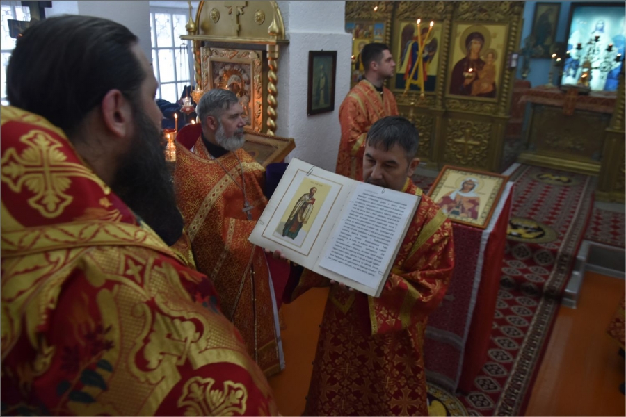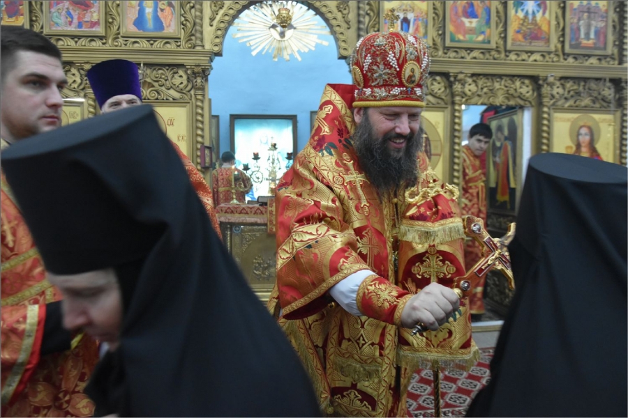Своему архипастырю сослужили благочинный Закамского церковного округа протоиерей Андрей Дубровин, настоятель Богоявленского храма города Менделеевска иерей Вячеслав Ильин, клирики монастыря иерей Даниил Кривов, иерей Илья Павлов. Диаконский чин возглавил протодиакон Дмитрий Половников.