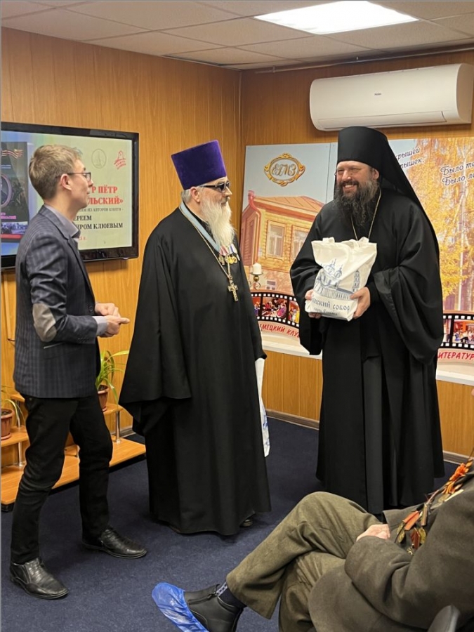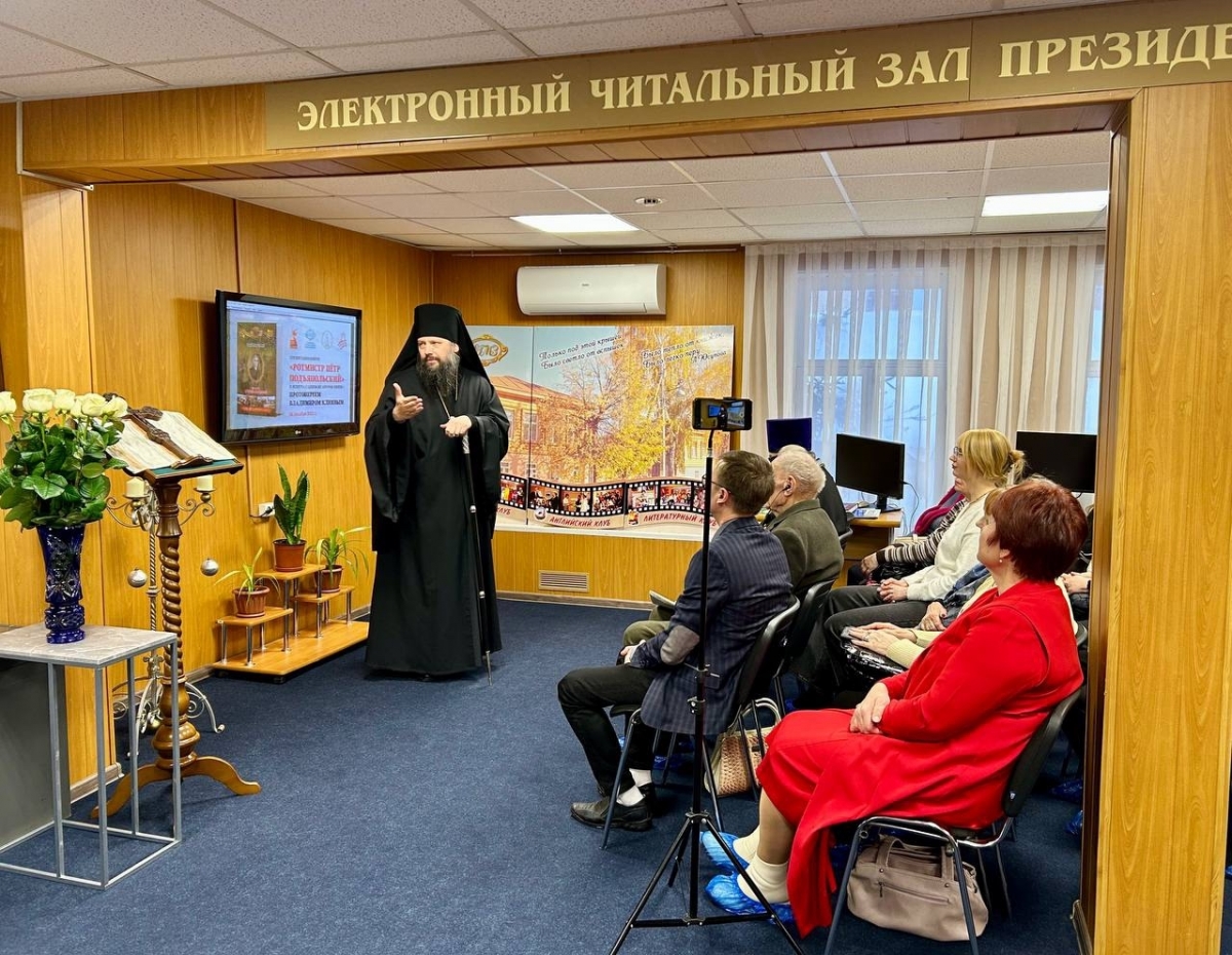Епископ Набережночелнинский и Елабужский Гавриил обратился к участникам мероприятия, сказав теплые слова благодарности в адрес авторов презентуемой книги и благословил встречу в Библиотеке Серебряного века.