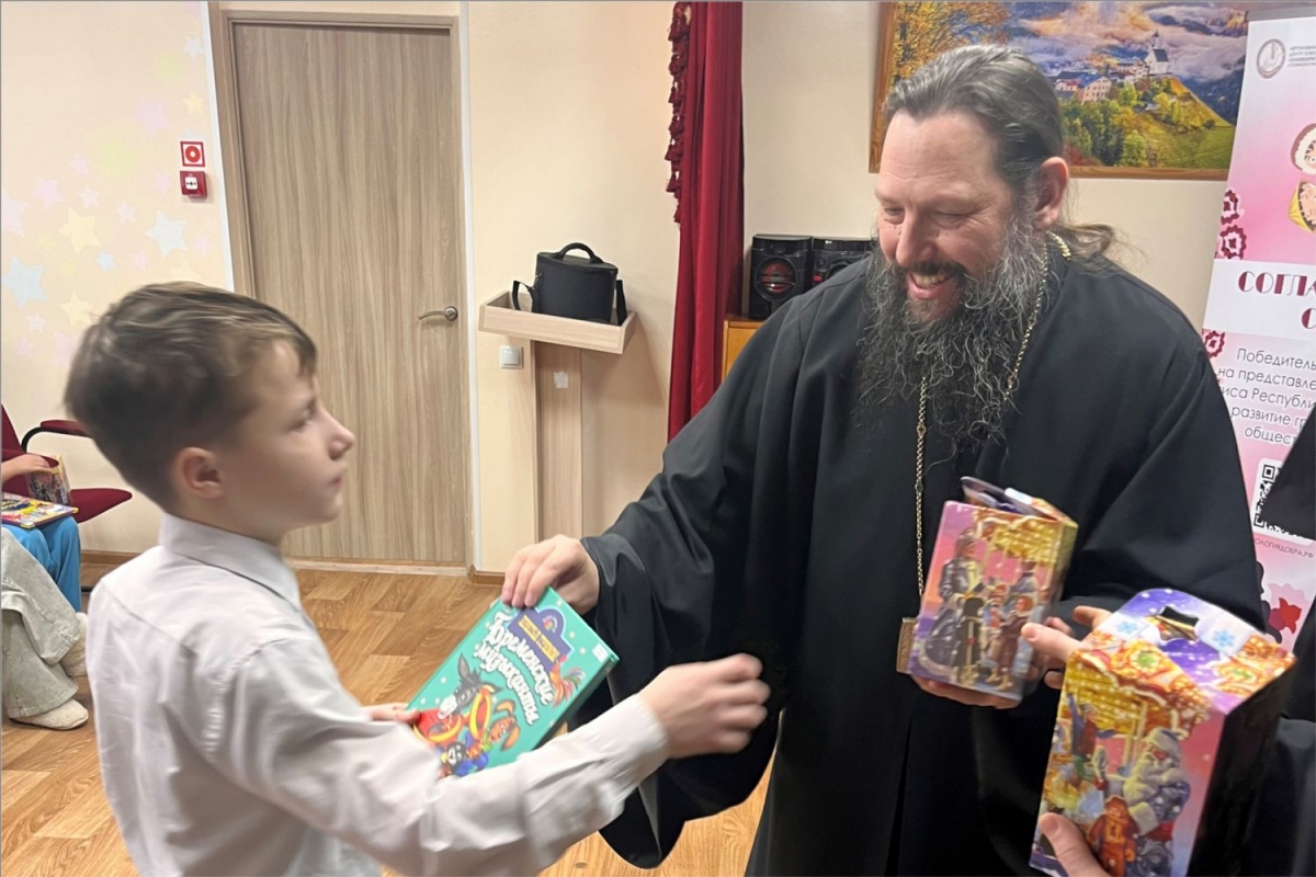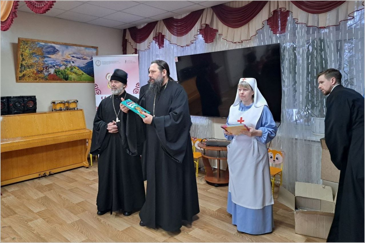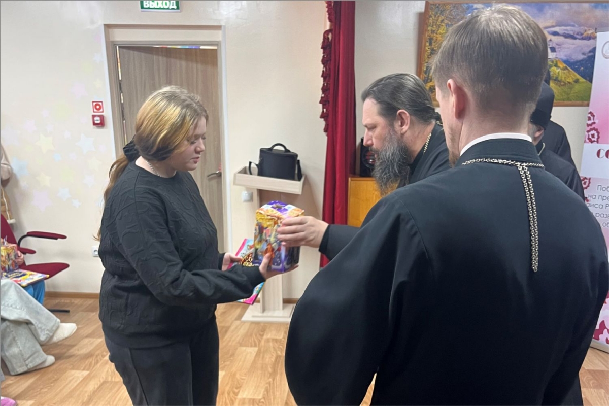 В этот же день иеромонах Амвросий (Степанюк), иерей Вячеслав Ильин и Ольга Шевелева вручили подарки детям в Комплексном центре социального обслуживания населения «Берег Надежды» для детей из семей, получающих социальные услуги в отделении социальной помощи семье и детям города Менделеевска.