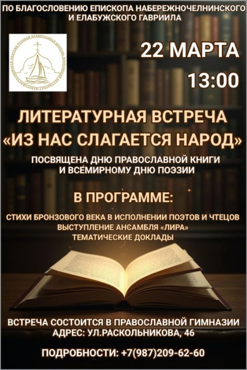 По благословению епископа Набережночелнинского и Елабужского Гавриила 22 марта в 13:00 в здании Православной гимназии города Набережные Челны (улица Раскольникова, 46) состоится литературная встреча. Мероприятие приурочено сразу к двум значимым датам: Дню православной книги и Международному дню поэзии.