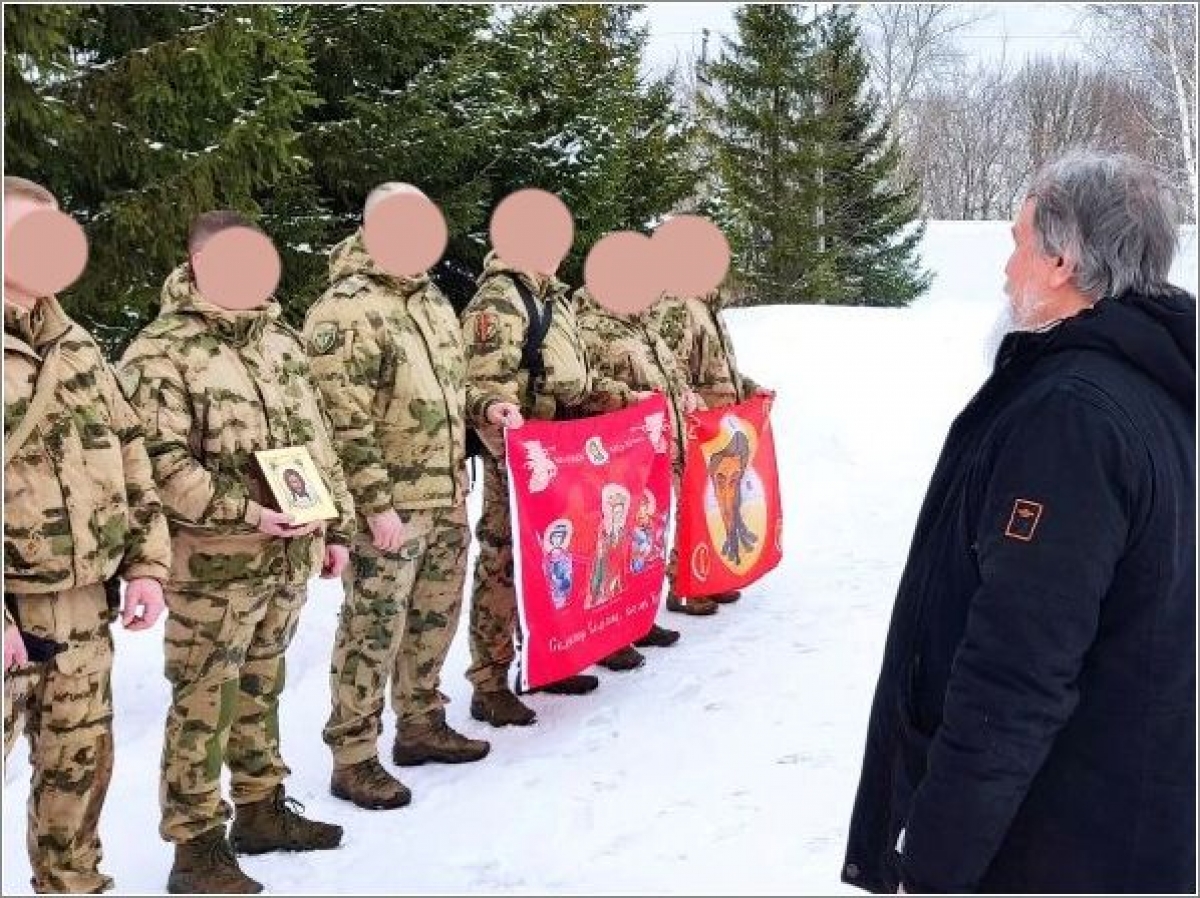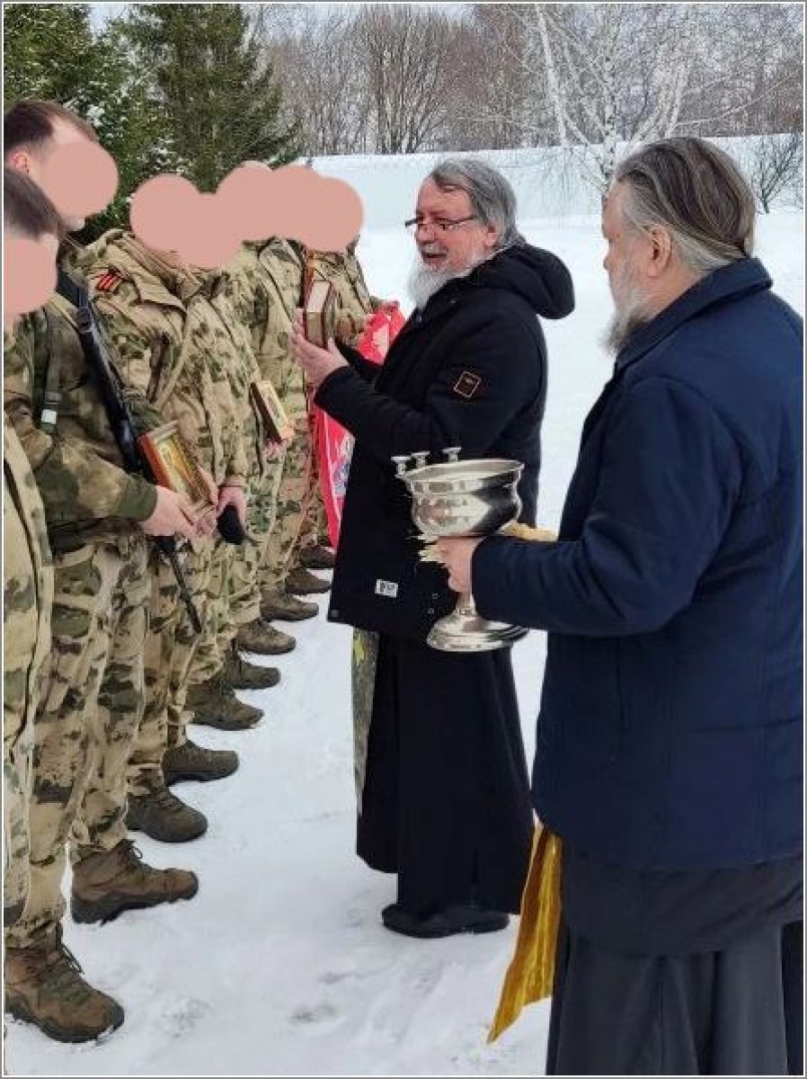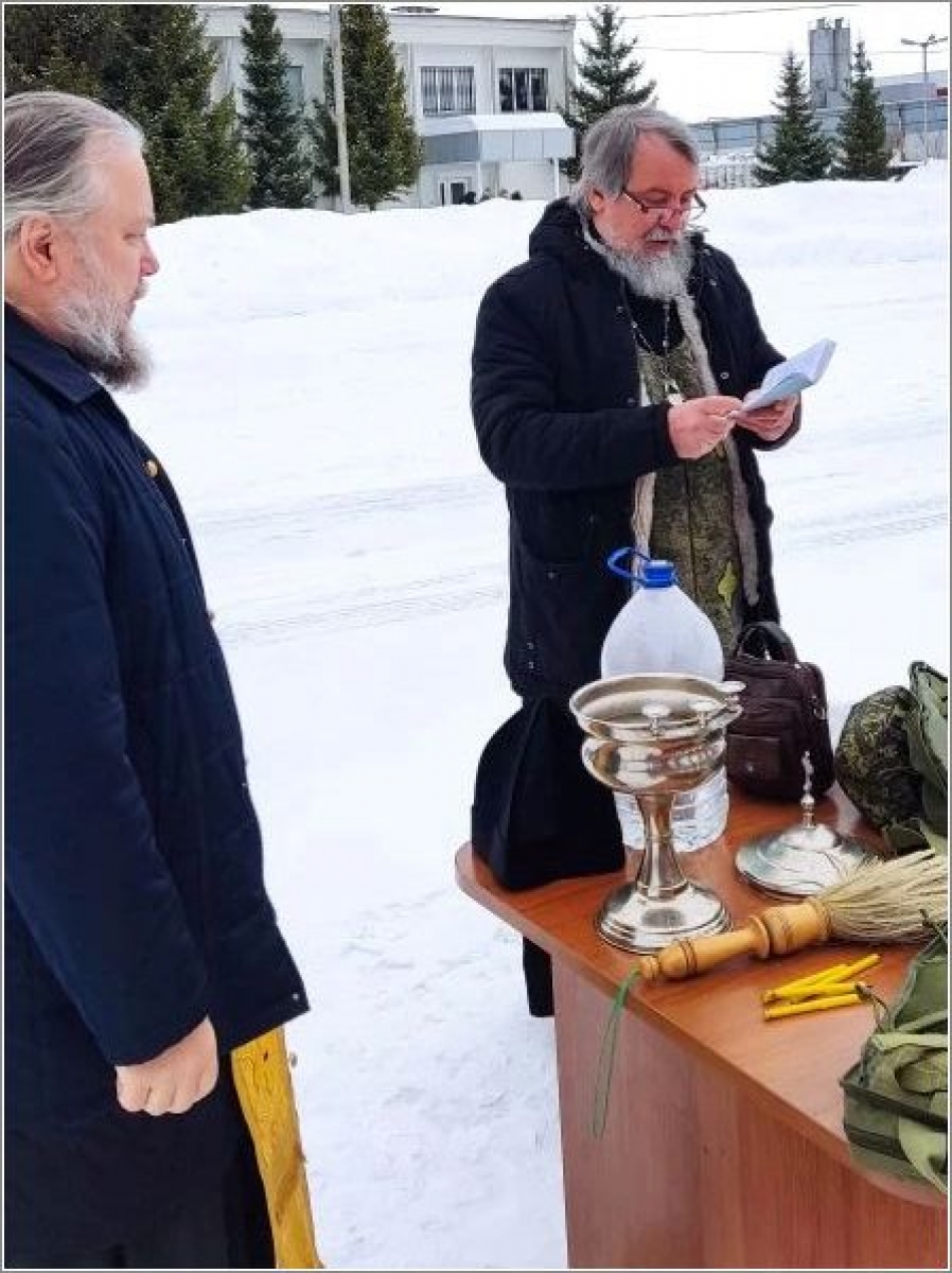 Духовную поддержку перед отправкой в зону боевых действий получили бойцы сводного отряда ОМОН «Тайфун»: протоиерей Владимир Силантьев, руководитель отдела по взаимодействию с вооружёнными силами и правоохранительными органами, и протоиерей Валерий Каранаев совершили специальный молебен о воинах, идущих на брань.