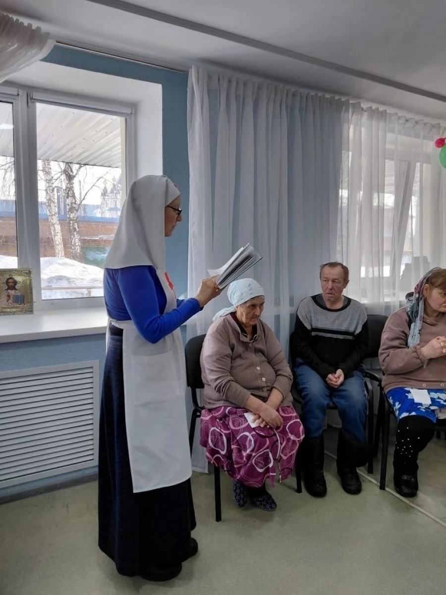 17 марта 2026 года в елабужском доме-интернате, предназначенном для граждан, имеющих психические расстройства, настоятель храма Воздвижения Креста Господня села Лекарево, помощник благочинного по работе с медицинскими учреждениями иерей Даниил Кривов совершил таинство елеосвящения (соборования). Помогали священнику представители Елабужского Свято - Елисаветинского общества милосердия: брат милосердия Алексей, сестры милосердия Вера и Лариса.