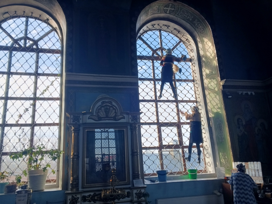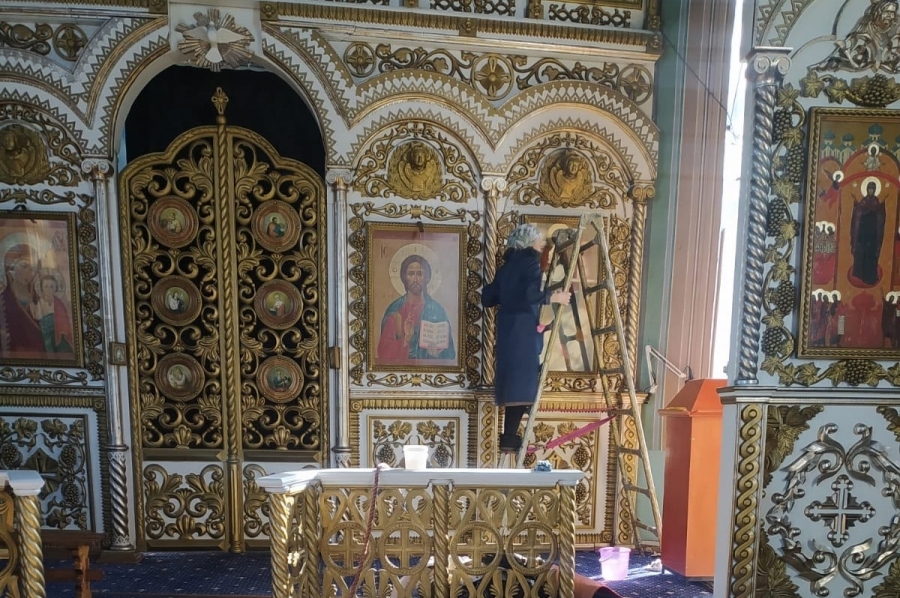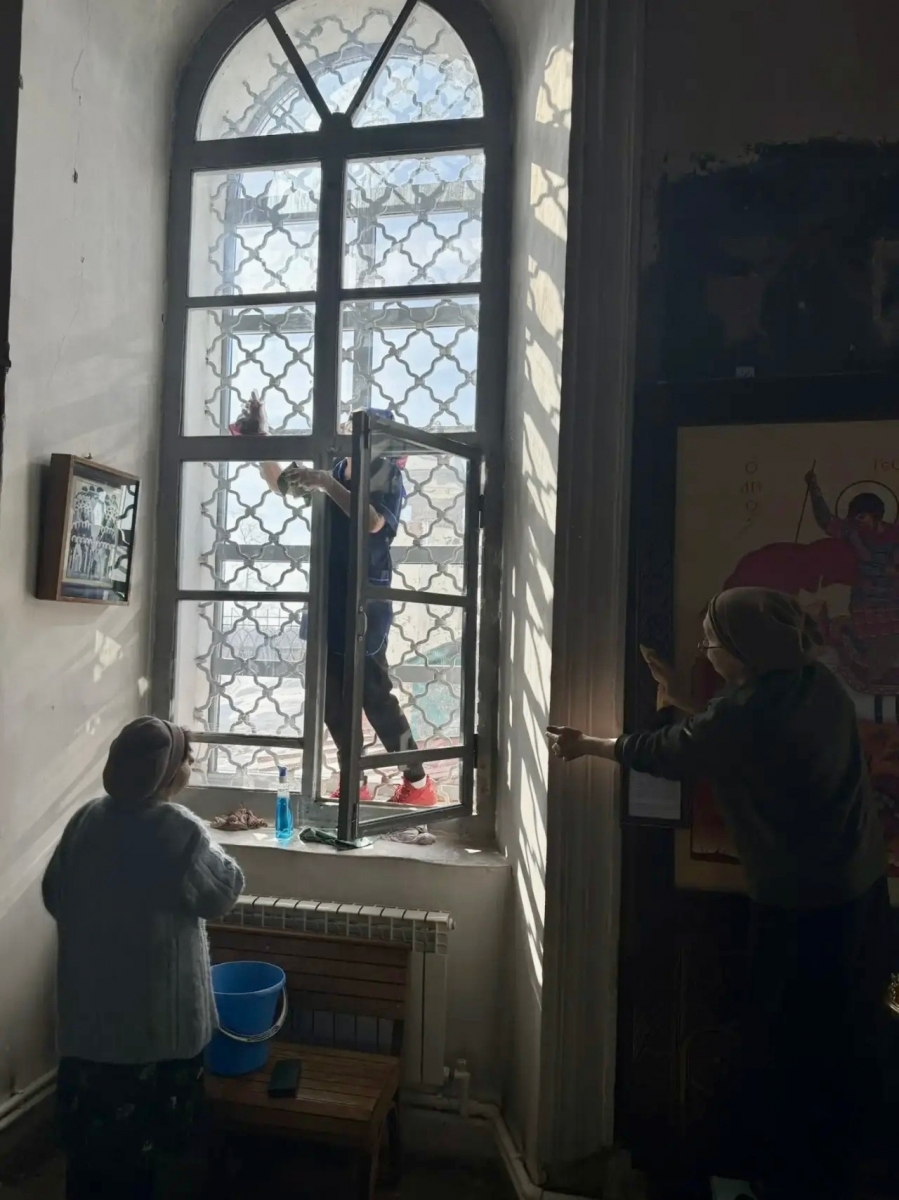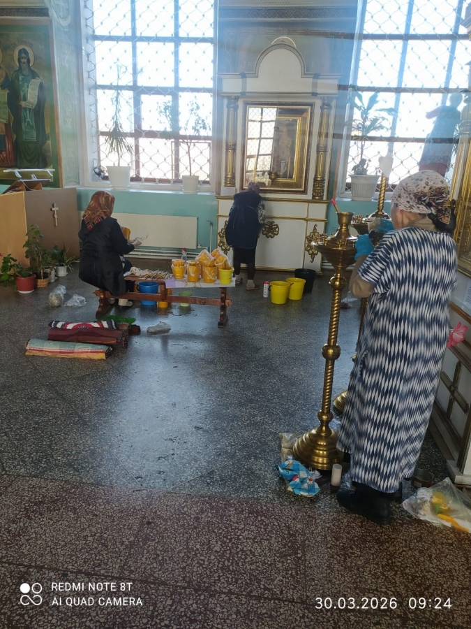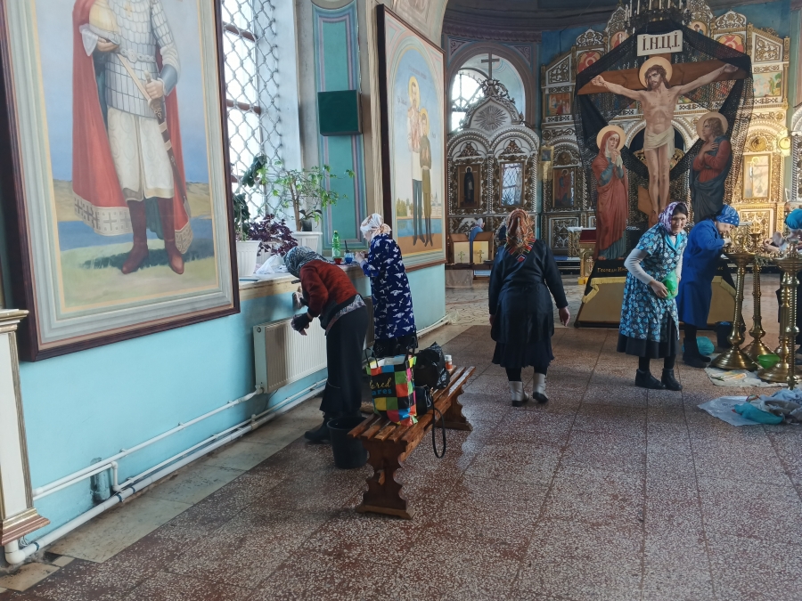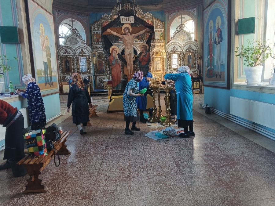 Прихожане организовали уборку в помещениях храма: помыли окна, стены и полы, протерли иконы и почистили подсвечники, выбили ковры.