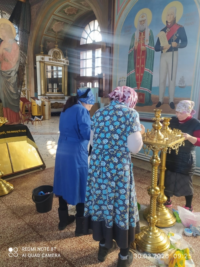 В уборке приняли активное участие члены приходской общины. Участники навели порядок в боковых приделах собора, в притворе и подсобных помещениях. Особое внимание уделили очистке подсвечников и церковной утвари, влажной уборке полов и подоконников, протирке икон и киотов.