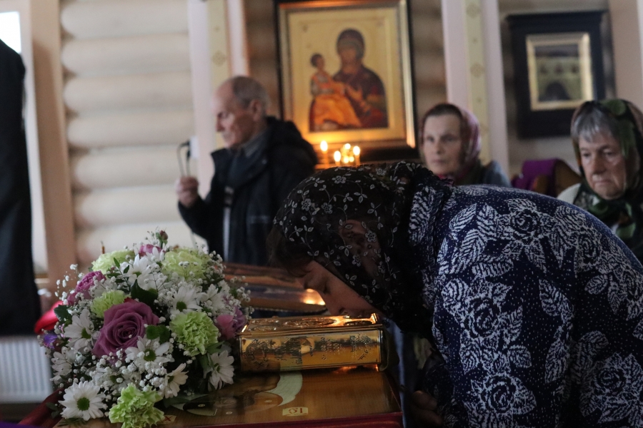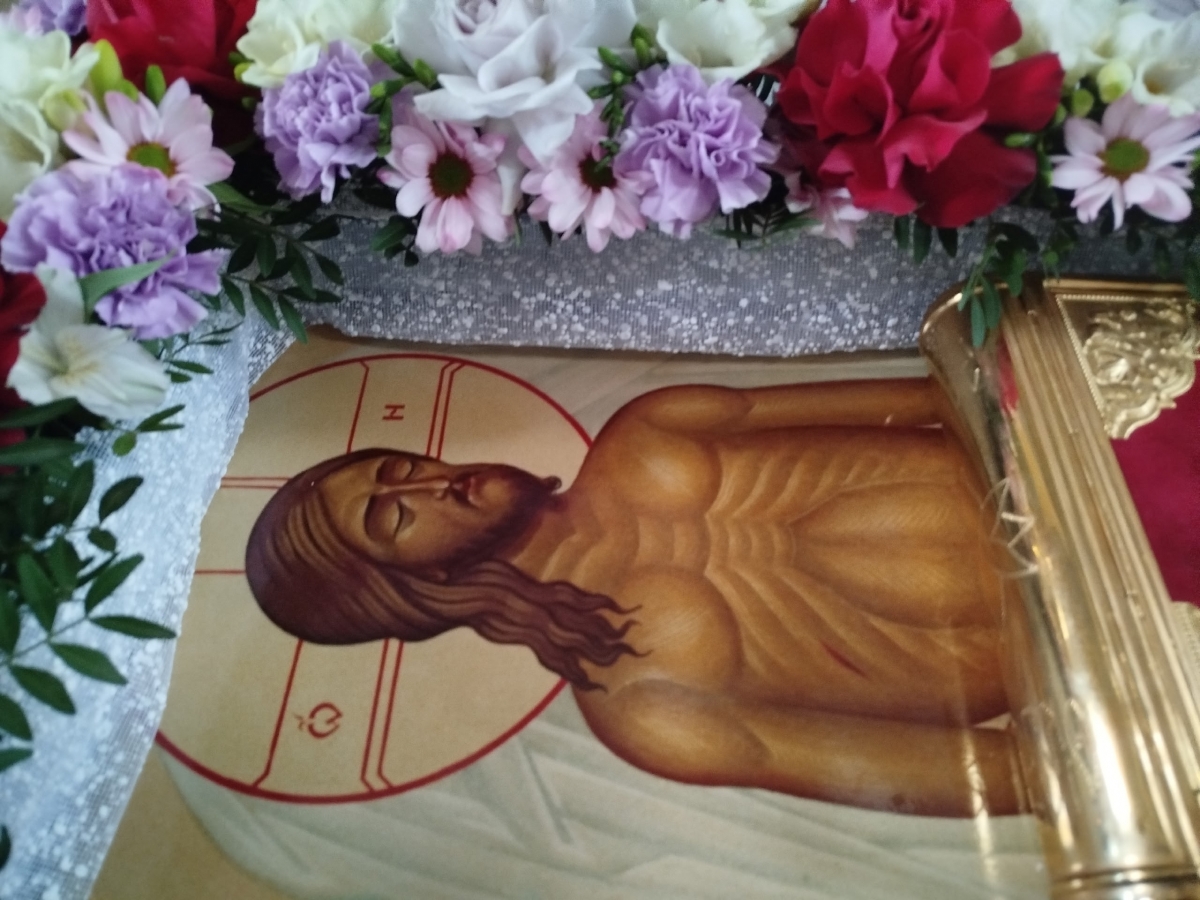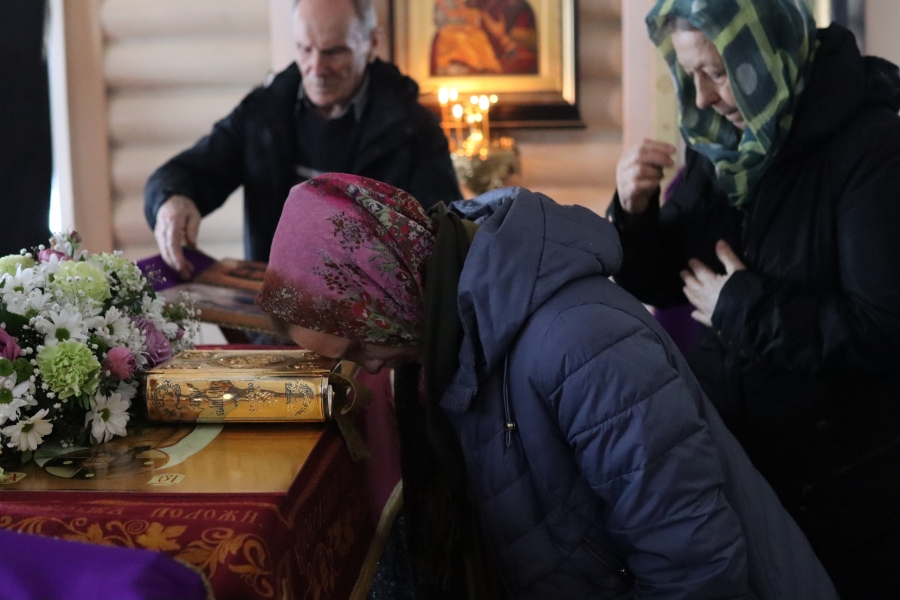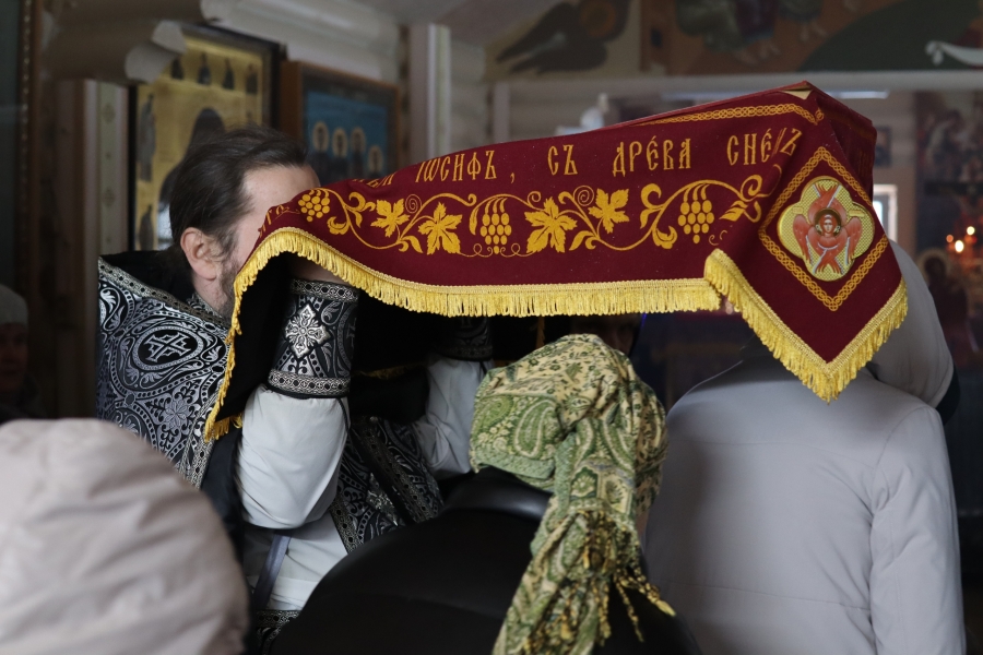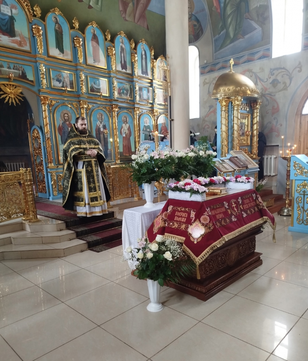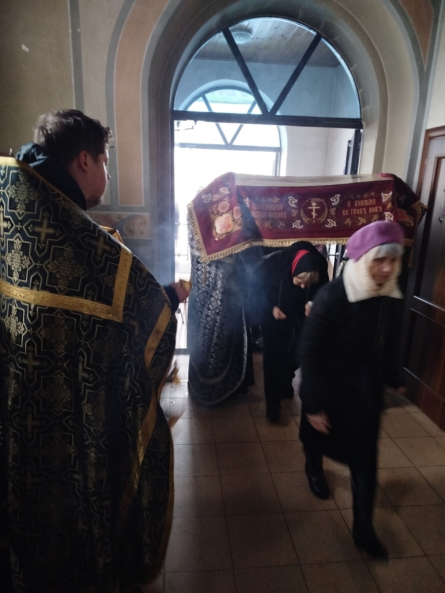 В конце вечерни, при пении тропаря «Благообразный Иосиф, с древа снем Пречистое Тело Твое», из алтаря на середину храма была перенесена Святая Плащаница с изображением погребения Христа, на середину Плащаницы было положено Евангелие.