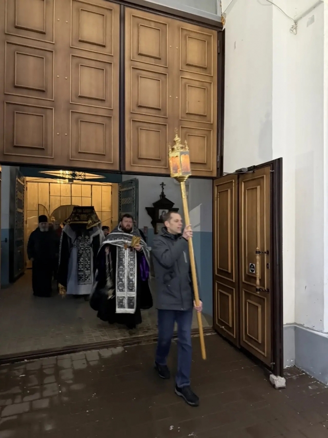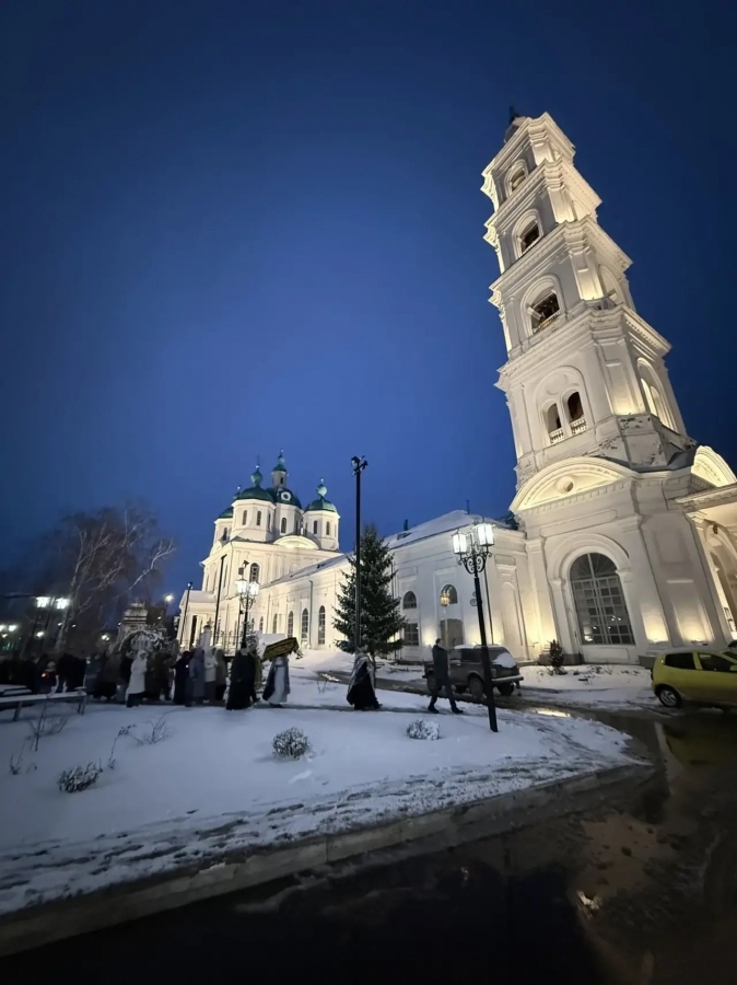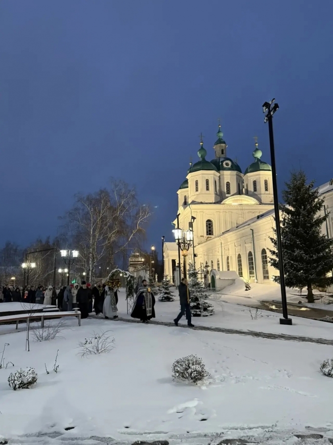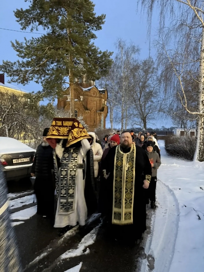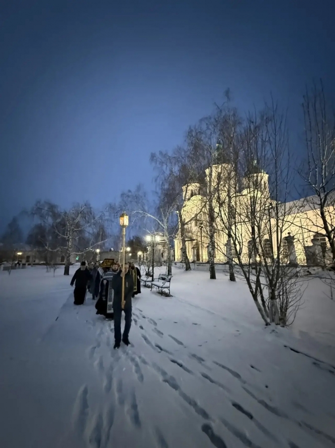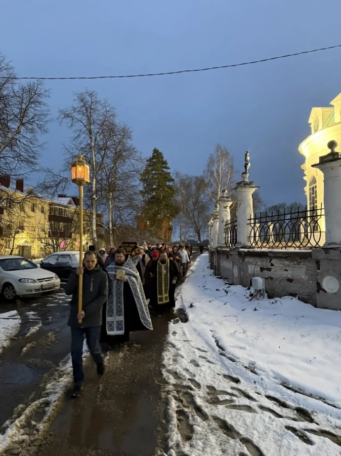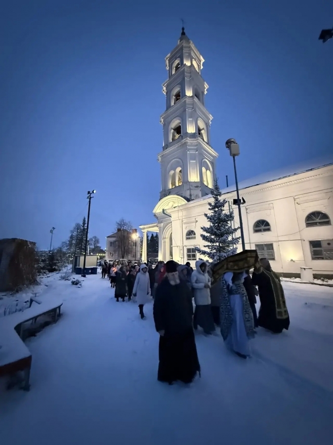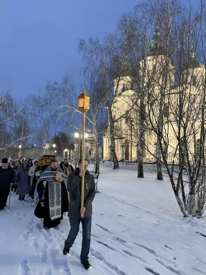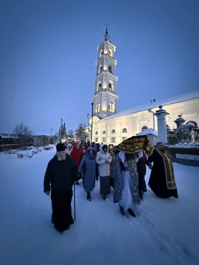 Торжественный чин, исполненный скорби и благоговения, напомнил всем о последних днях земной жизни Спасителя. Кульминацией стала процессия с Плащаницей: крестный ход обошёл храм под размеренный грустный колокольный звон, а следы участников ложились на нетронутый снег — словно запечатлевая молитвенное единство общины.