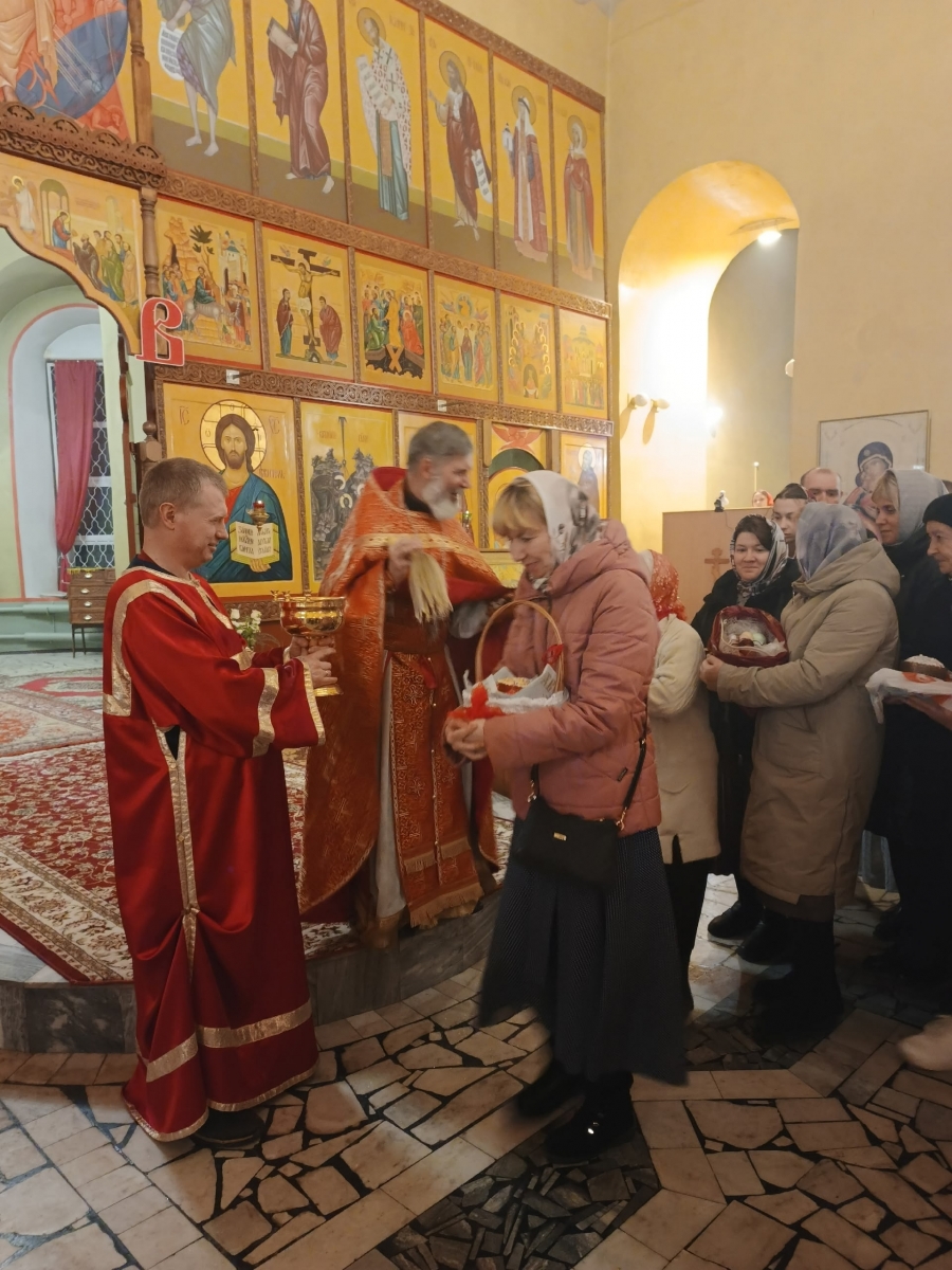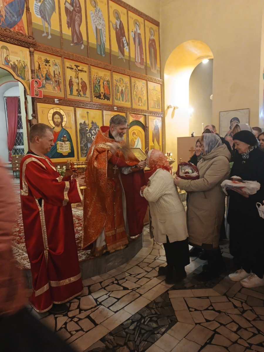 По заамвонной молитве освятили Артос (Пасхальный хлеб). После Богослужения отец Вячеслав освятил Пасхальные яства (куличи, пасхи и яйца).