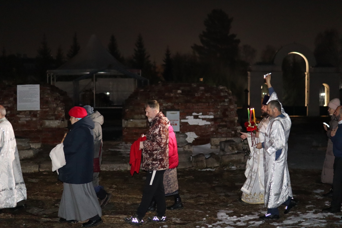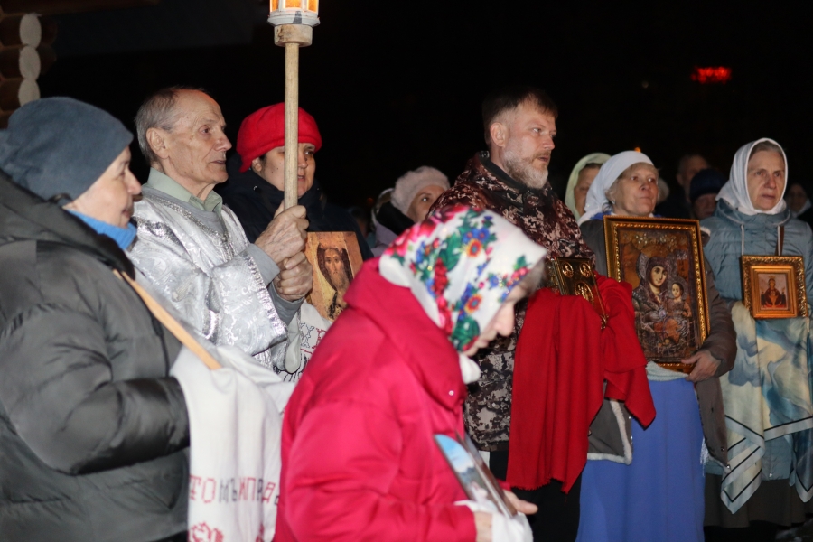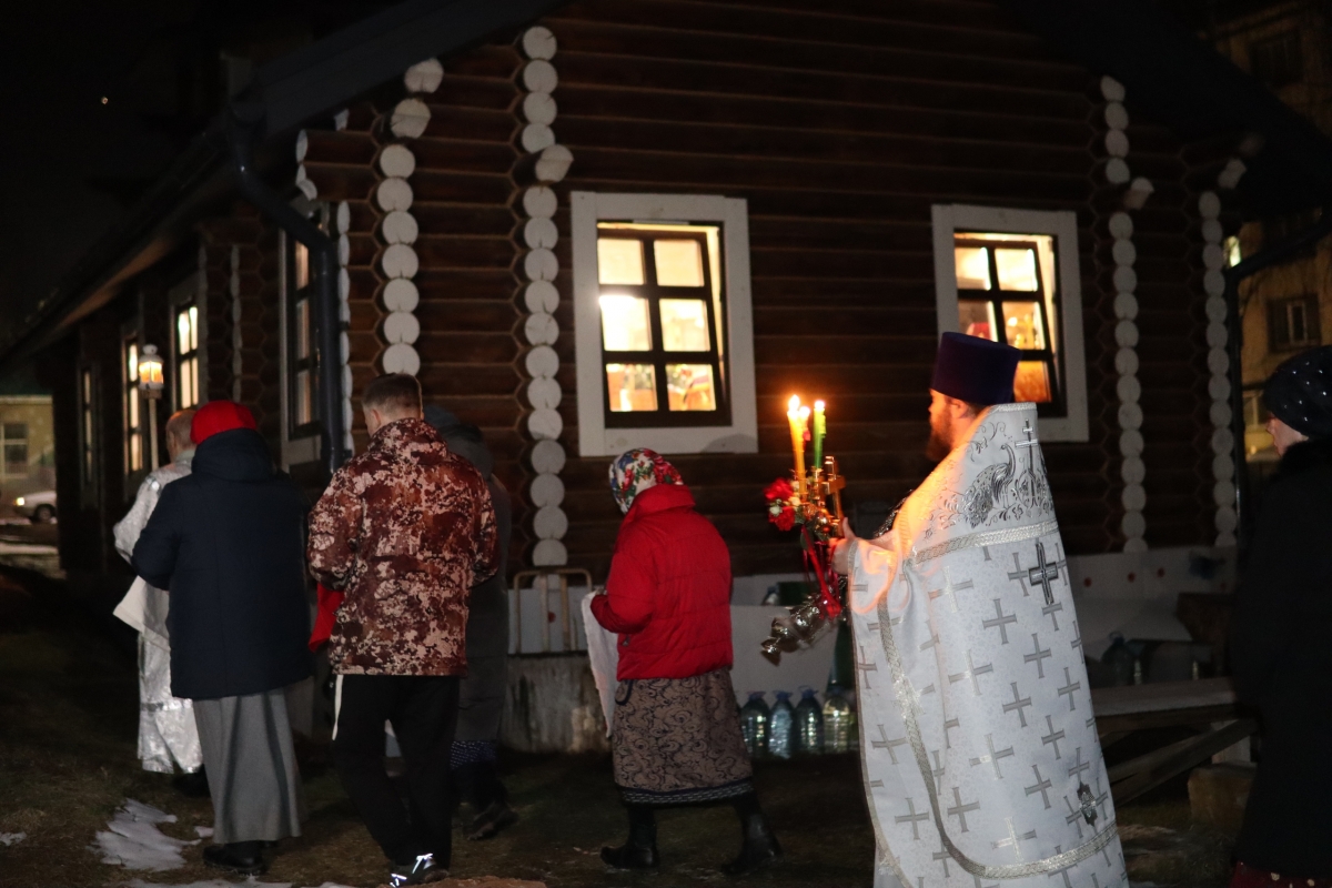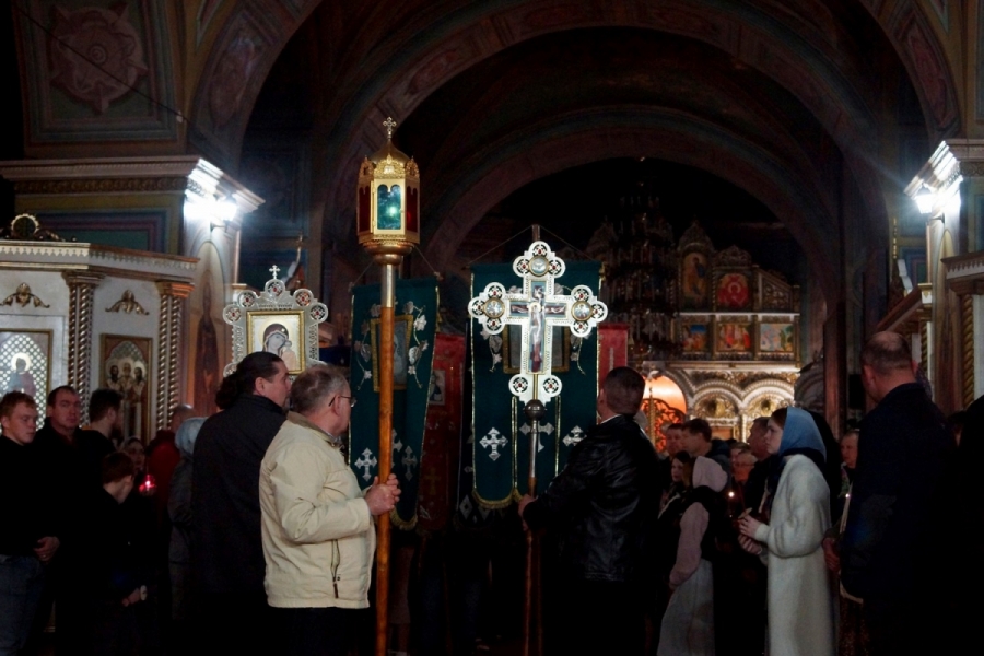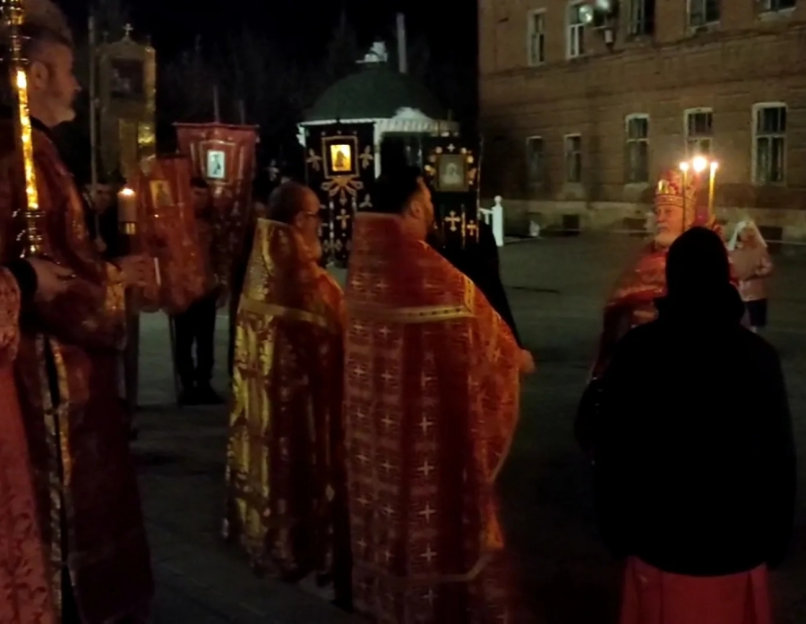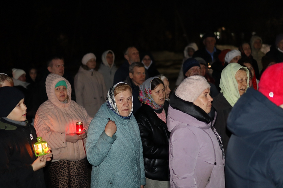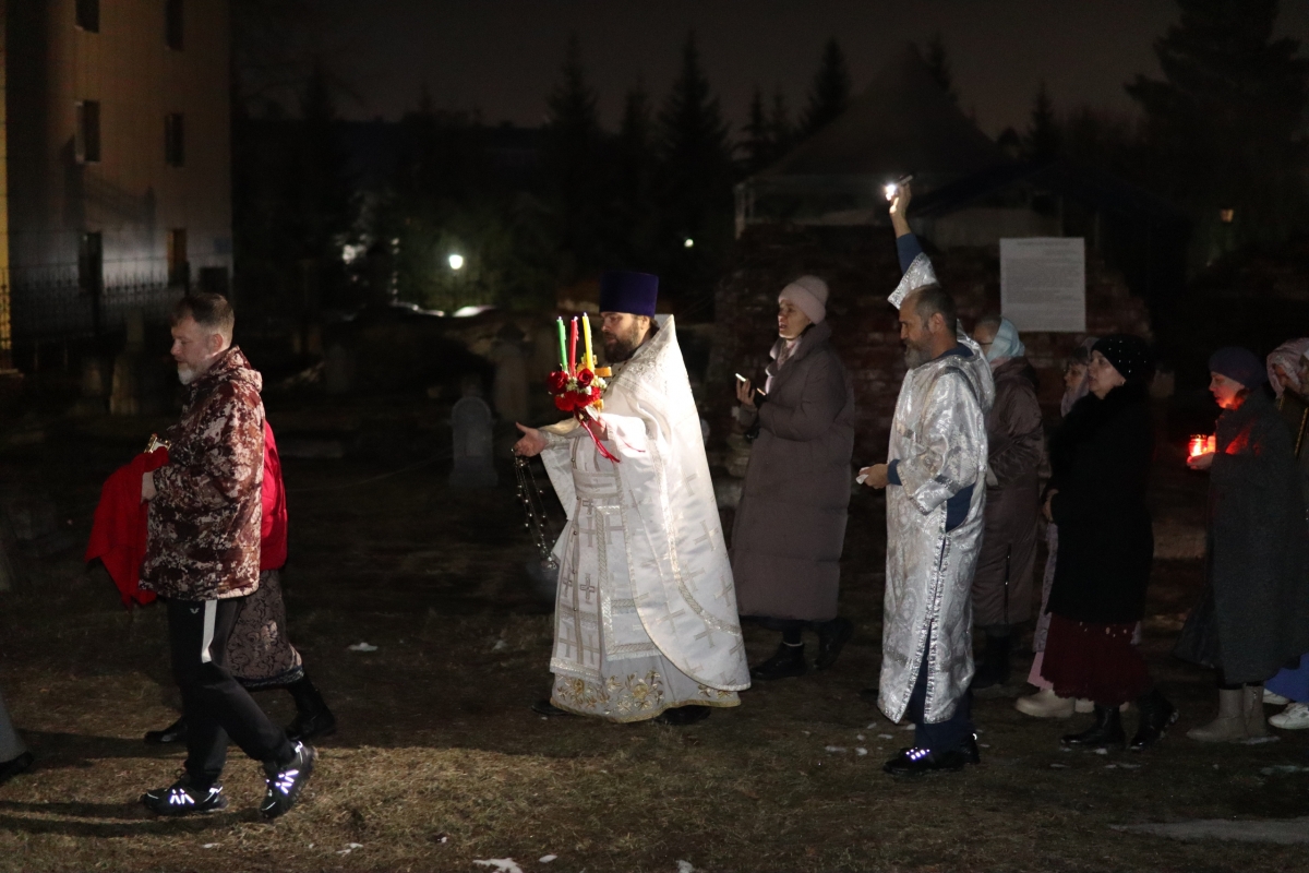 Под пение стихиры «Воскресение Твое, Христе Спасе» был совершен крестный ход по старинному Троицкому кладбищу и вокруг храма. Шествие, возглавляемое священником, знаменует собой путь навстречу Воскресшему Богу. Затем верующие с лампадками и свечами остановились у входа перед закрытыми церковными дверями, символизирующими вход в пещеру Гроба Господня. Отец Илия трижды пропели пасхальный тропарь, и зазвучали торжественные слова «Христос Воскресе!».