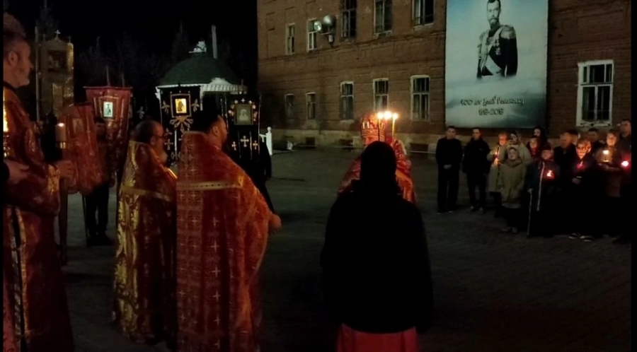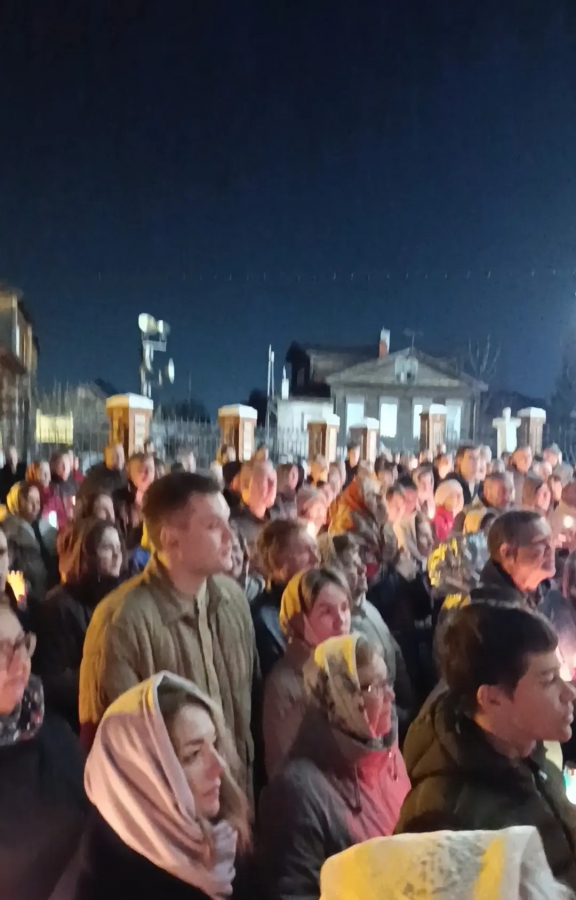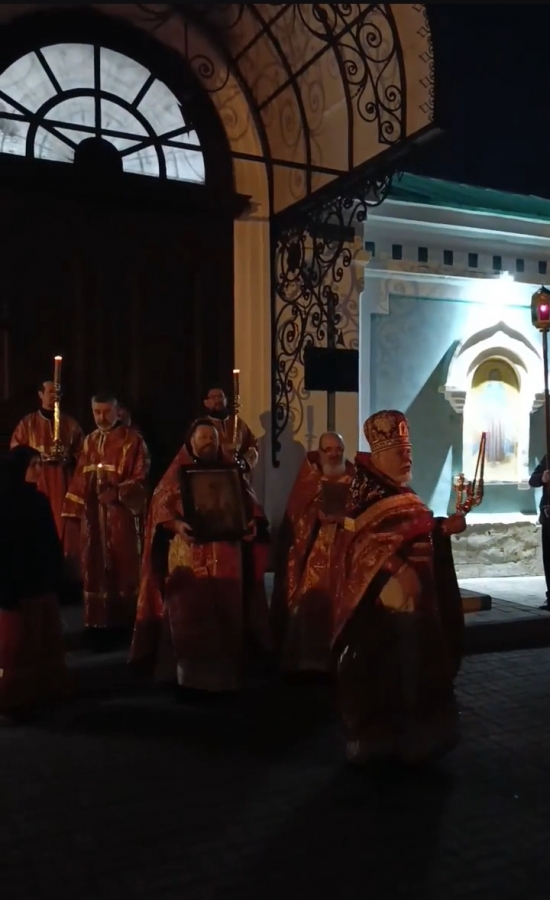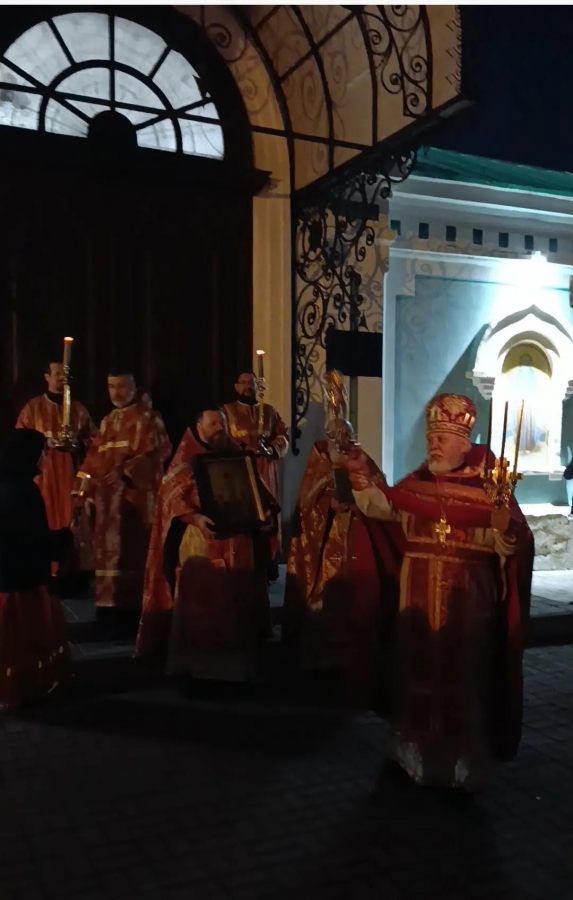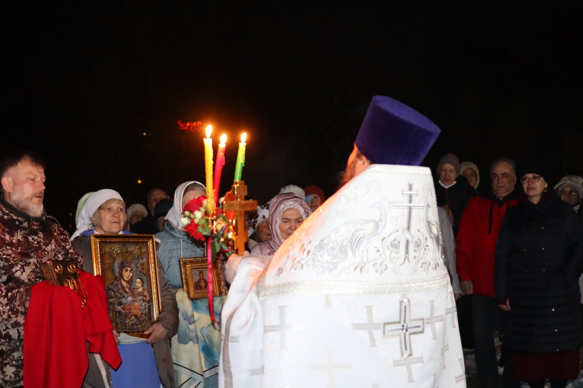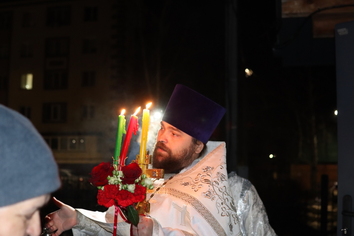 Ровно в полночь, священнослужители и прихожане с зажженными свечами прошли крестным ходом вокруг храма, под звон колоколов. И в тишине ночи впервые зазвучало — «Христос Воскресе!» И радостный ответ — «Воистину Воскресе!» Все пропели пасхальный тропарь: «Христос воскресе из мертвых, смертию смерть поправ и сущим во гробех живот даровав», и с ним зашли в храм.