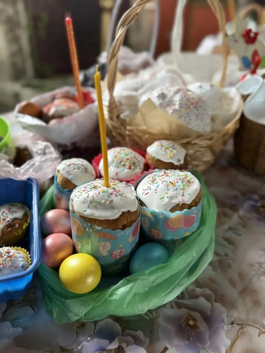 После литургии иеромонах Кирилл освятил пасхальную снедь.
