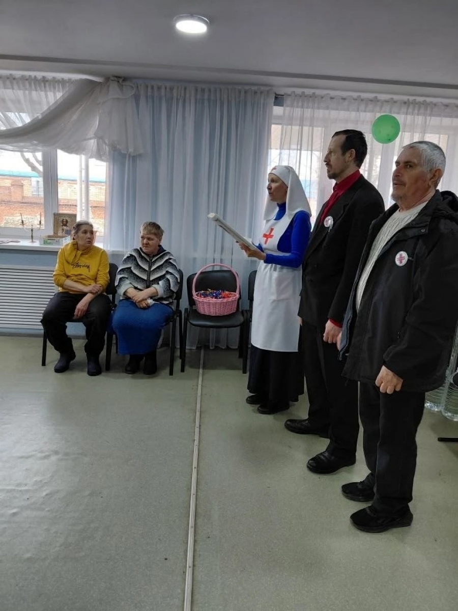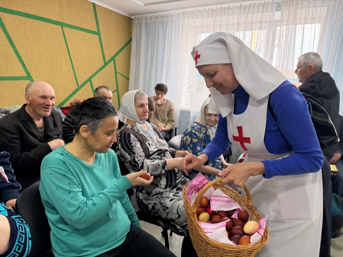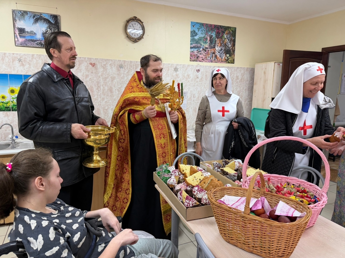 13 апреля 2026 года, в Светлый понедельник Пасхального Торжества, настоятель храма Воздвижения Креста Господня села Лекарево, помощник благочинного по работе с медицинскими учреждениями иерей Даниил Кривов совместно с братьями милосердия Алексием и Владимиром, сестрами милосердия Верой, Наталией и Ларисой Елабужского Свято - Елисаветинского общества милосердия посетили Елабужский Дом - интернат, предназначенный для граждан, имеющих психические расстройства, чтобы поздравить проживающих насельников со Светлыми Пасхальными днями и вручить праздничные угощения.